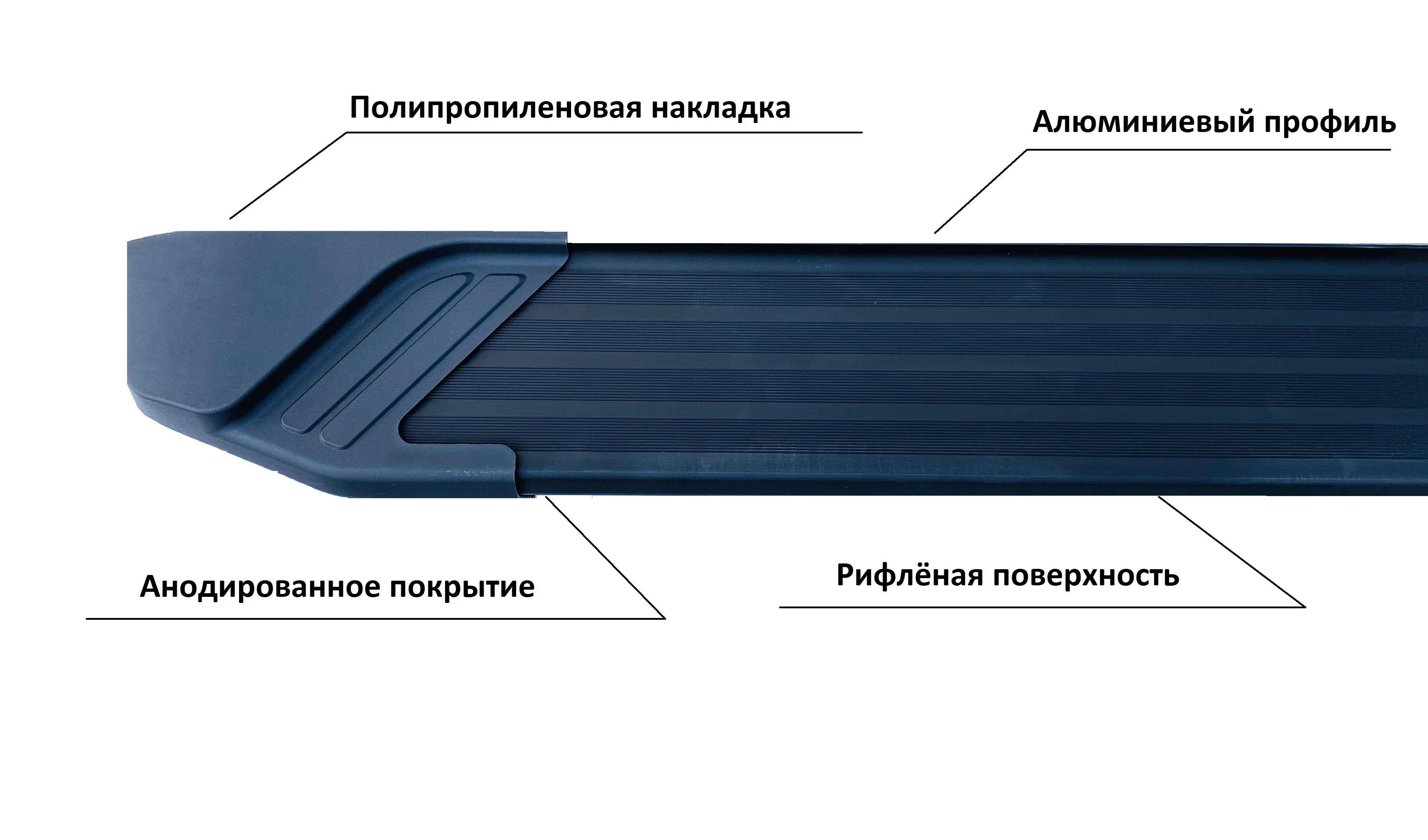 по бокам установлены полипропиленовые накладки, что завершает внешний вид порога и добавляет индивидуальности Вашему автомобилю, которые в случае наезда на препятствие легко заменить