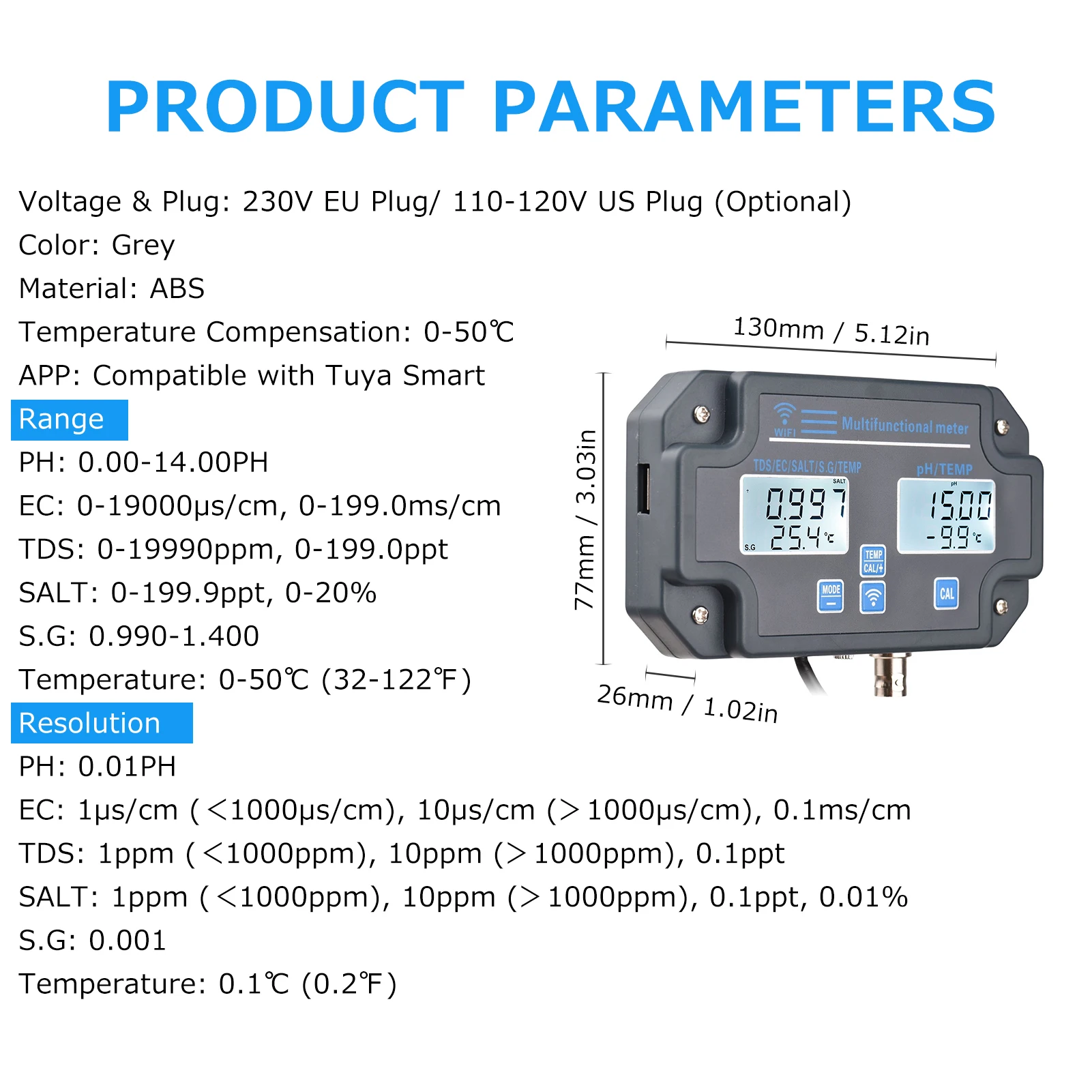 Это простой в использовании инструмент для проверки качества воды питьевой воды, аквариума, гидропоники, бассейна и так далее. Он Многофункциональный и может тестировать PH/ EC/ TDS/ SALT/ S.G/температуру. Кроме того, он поддерживает пульт дистанционного управления APP, что делает его более удобным для мониторинга в любое время в любом месте.
