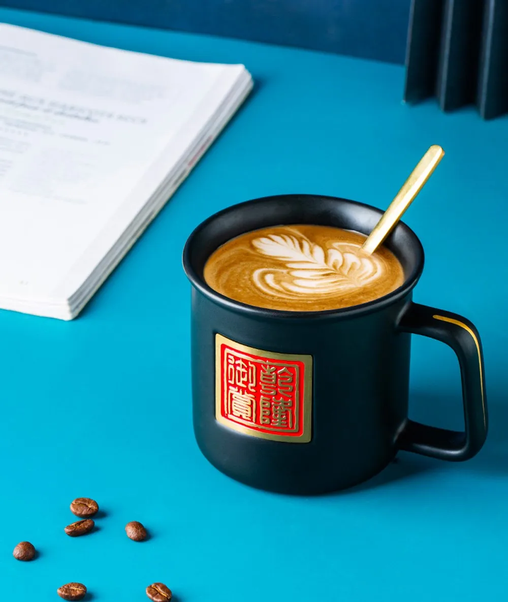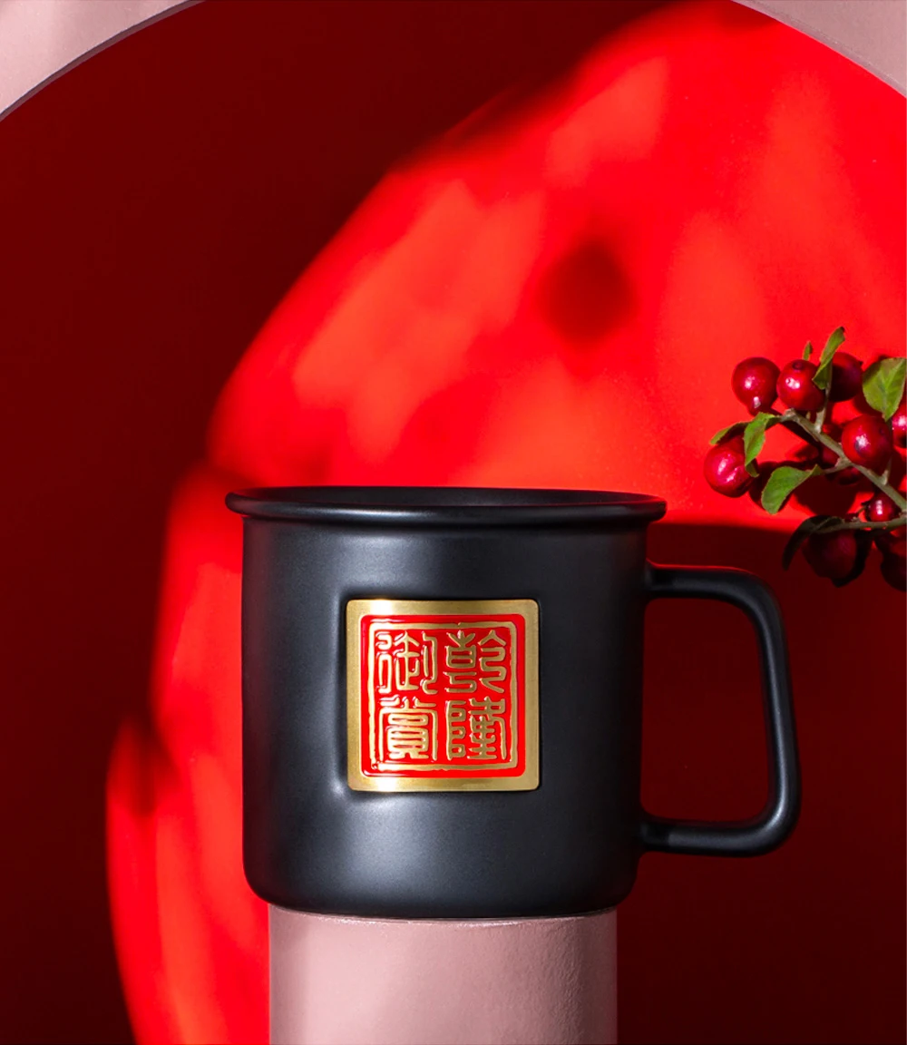 В основу дизайна этой кружки легла большая нефритовая печать императора Цяньлуна, хранящаяся в музее Императорского Дворца. Печать, которой заверялись священные своды, шедевры живописи и каллиграфии теперь на образце керамического искусства. Она глубоко инкрустирована в поверхность кружки, что символизирует глубокую взаимосвязь древних эпох и современности.