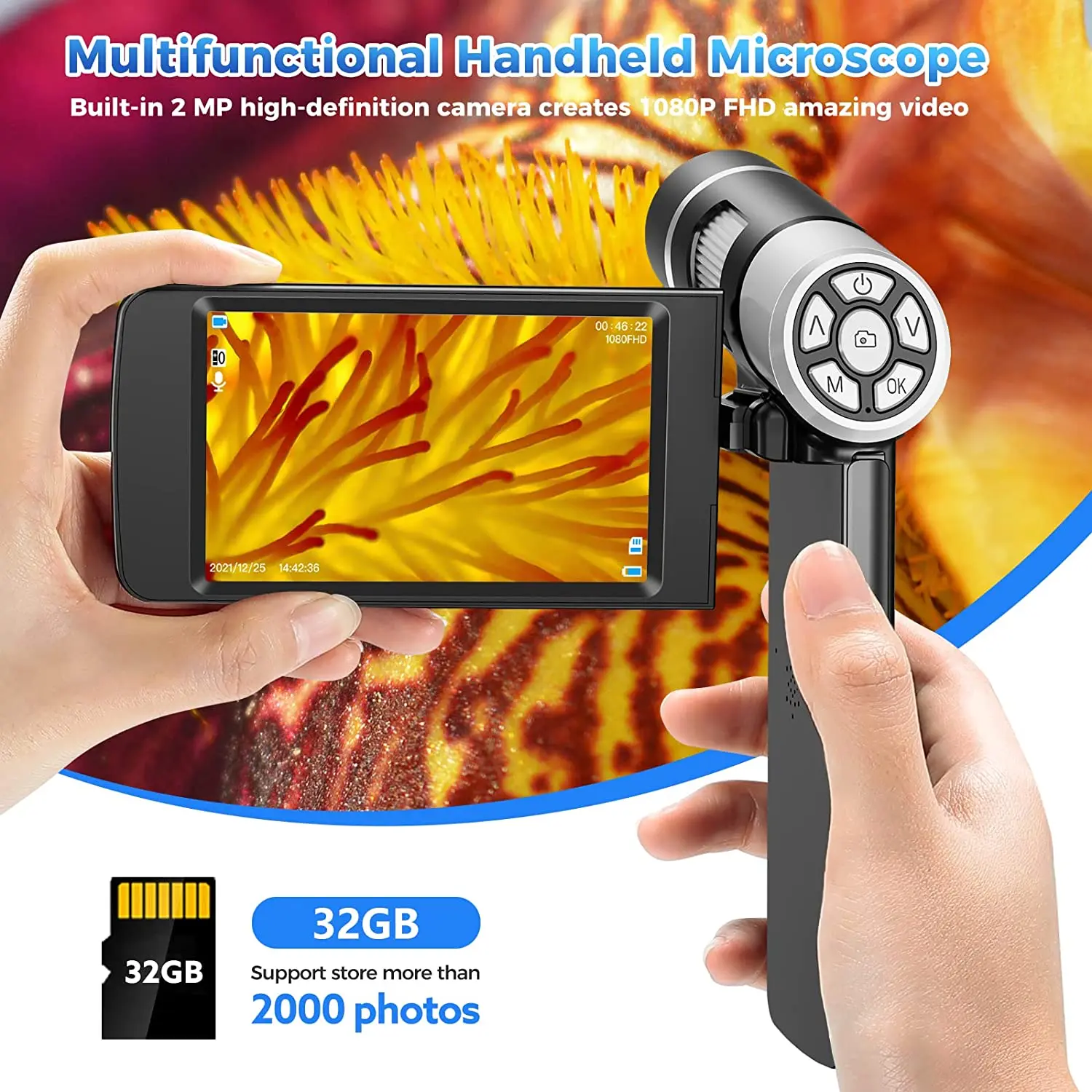 【 4-дюймовый ЖК-дисплей складной Экран 】Upgraded дизайн переосмысливает традиционные Микроскоп-сочетают в себе микроскоп с vlog Камера для более удобного использования. (Регулируемая на 180 °) Вращающийся экран 1080FHD улучшает эргономику и устраняет напряжение глаз и шеи.