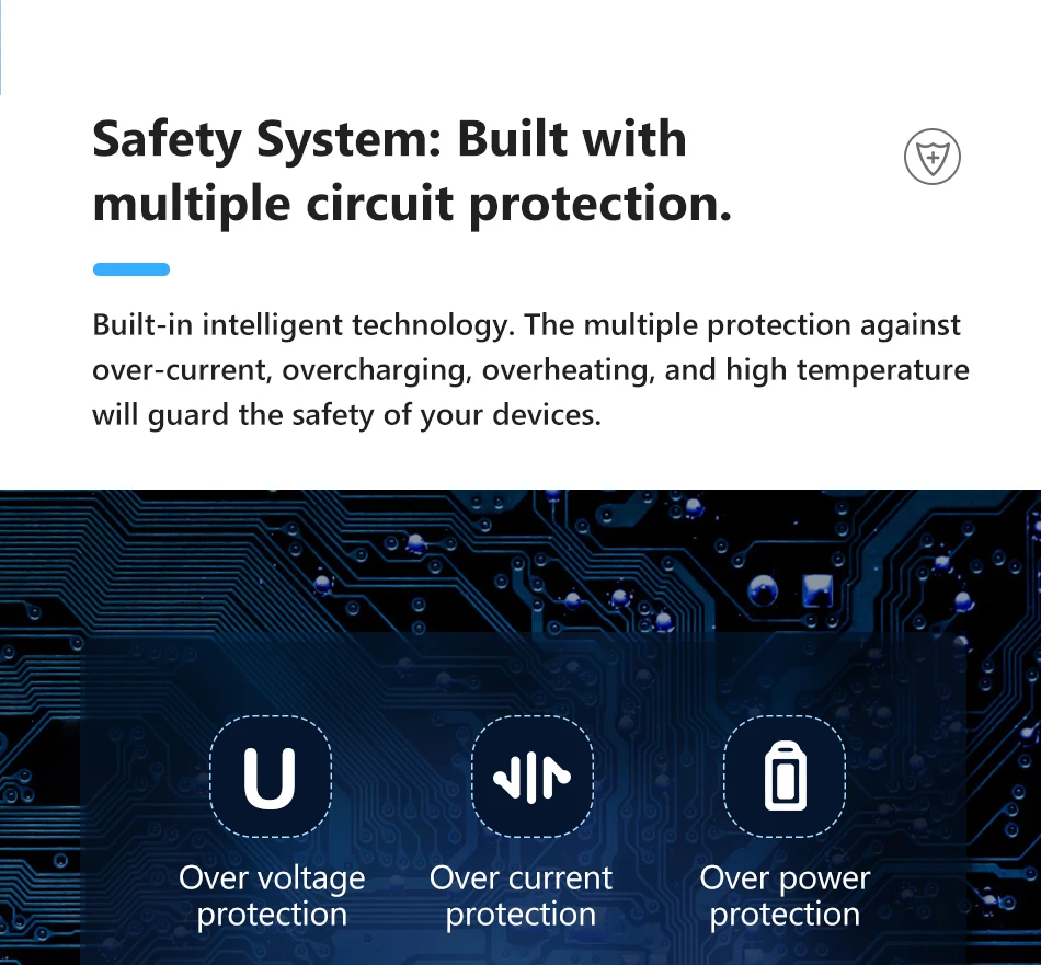 Встроенная интеллектуальная технология. Множественная защита от перегрузки по току, перезарядки, перегрева и высокой температуры защитит безопасность ваших устройств.