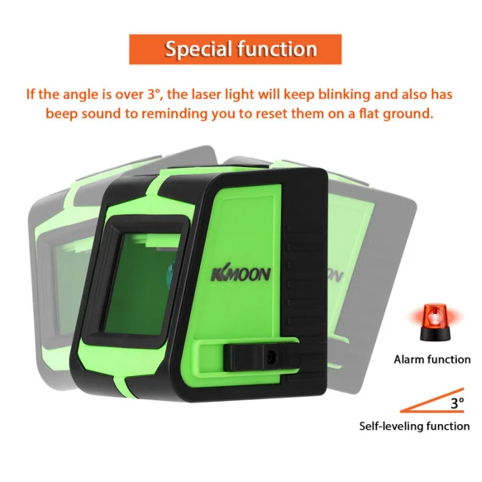 Оснащен функцией самостоятельной калибровки, ≤ 3 ° автоматическое выравнивание, но если угол превышает 3 °, лазерный светильник будет продолжать мигать, а также имеет звуковой сигнал, чтобы напомнить вам, чтобы сбросить их на ровную поверхность.