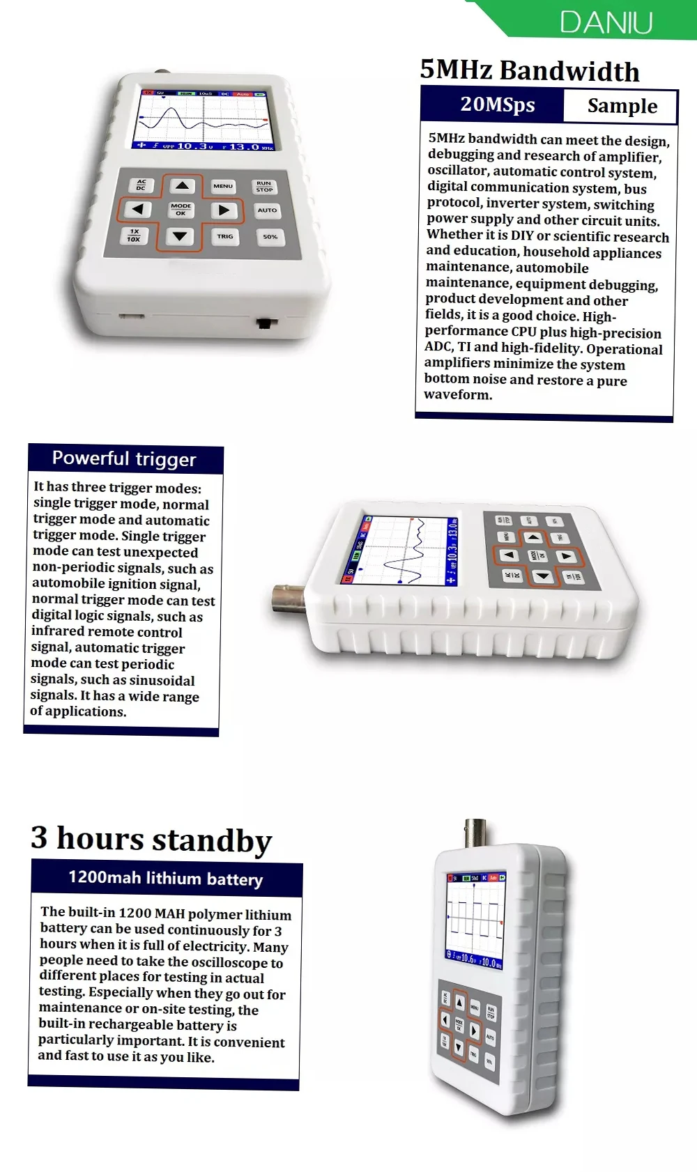 Осциллограф имеет до 20 мс/с частотой дискретизации в реальном времени и аналоговой пропускной способностью 5 МГц.