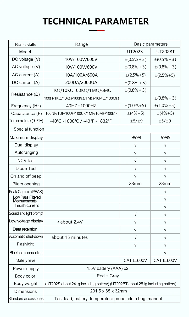 UT202S/UT202BT-это портативный цифровой хомут true RMS с стабильной производительностью, новой структурой, высокой надежностью и высокой безопасностью. Полнофункциональный автоматический диапазон, 9999 цифр дисплея, высокая производительность. UT202S может автоматически определять и измерять напряжение переменного/постоянного тока, ток переменного тока, сопротивление и непрерывность цепи; И может быть выбран через кнопки для измерения емкости, диода, постоянного тока микроампер тока, нейтральное Обнаружение живого провода (live), датчик температуры и бесконтактного напряжения переменного тока (NCV). UT202BT измеряет напряжение переменного/постоянного тока, ток переменного тока, низкое пропускающее фильтрованное напряжение/ток, пик тока/тока, сопротивление, непрерывность цепи, емкость, температуру, И бесконтактный датчик напряжения переменного тока (NCV). В то же время, он имеет функцию Bluetooth, которая может быть подключена к мобильному приложению для реализации дистанционного наблюдения данных и управления прибором.