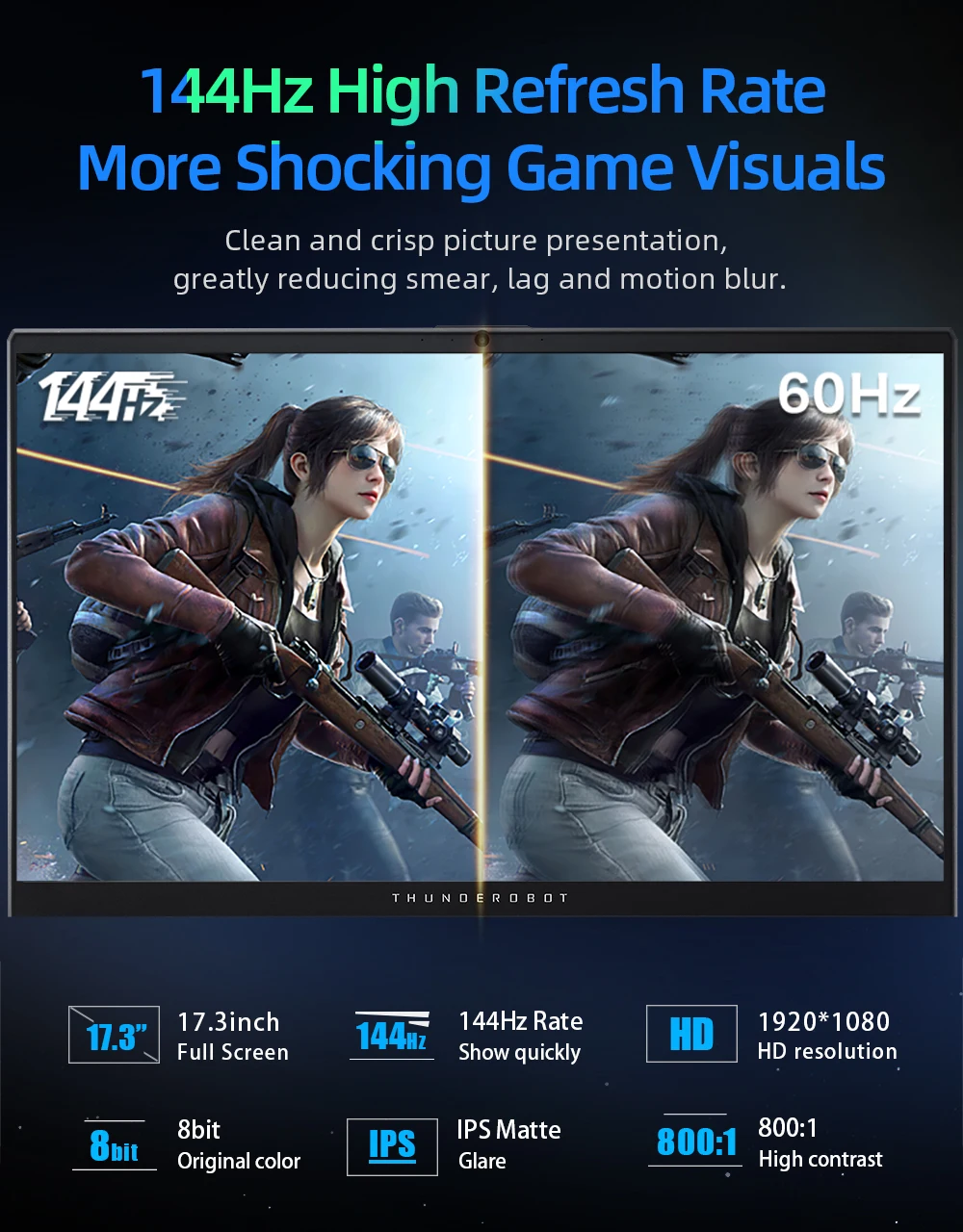 144 Гц Высокая частота обновления, чистый и быстрый дисплей изображения, отсутствие размытия и размытия движения.