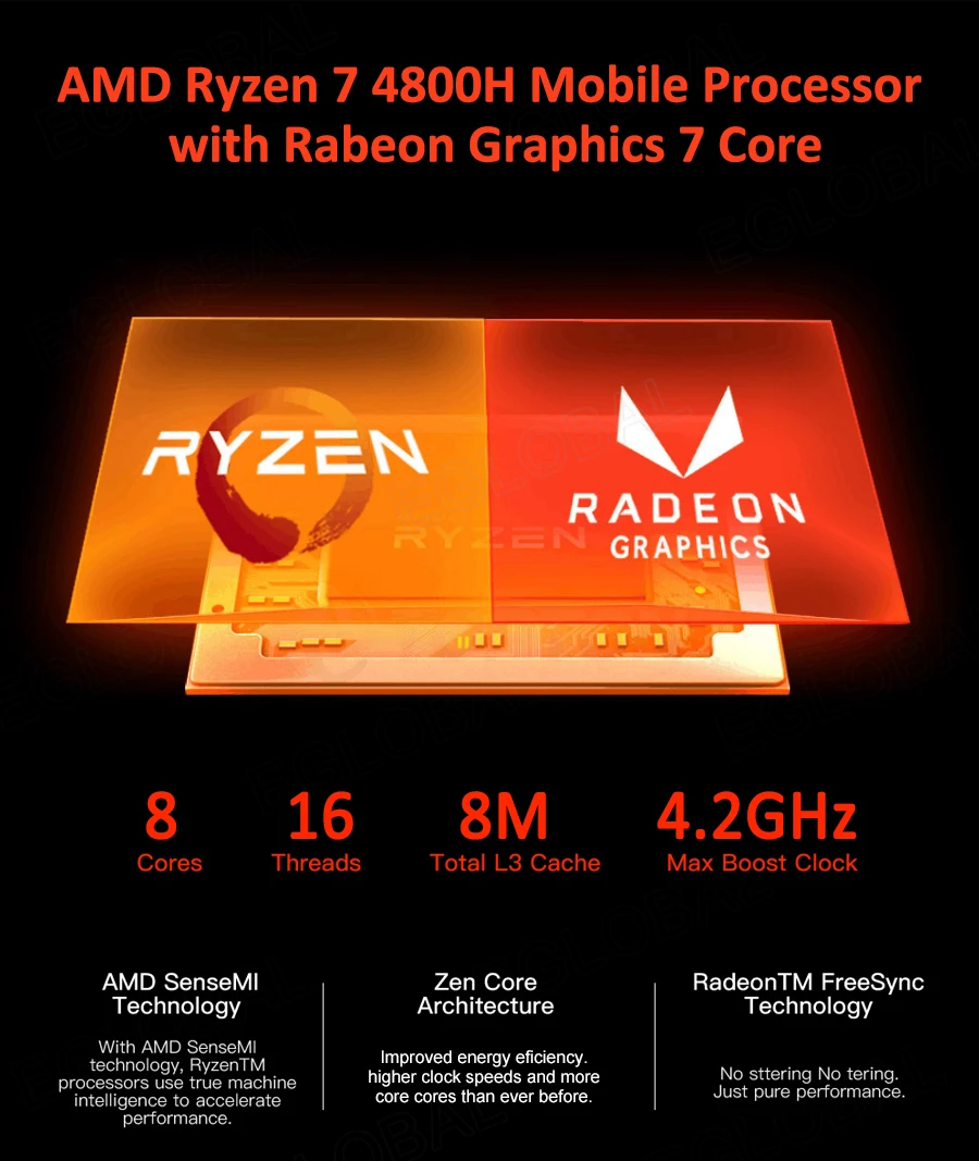 7 нмAMD Ryzen 7 (pro) 4800H 8 ядер 16 потоков 2,9 ГГц до 4,2 ГГц 8 Мб кэш TDP 45 Вт Radeon™Графика 7 ядер 1600 МГц.