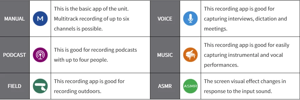 Приложения для записи, такие как базовая многотрековая запись, подкашивание, музыка, голос (интервью, vlog), полевая запись, ASMR и многое другое