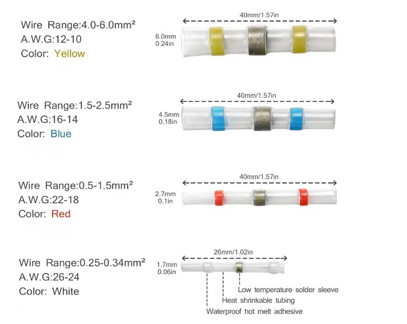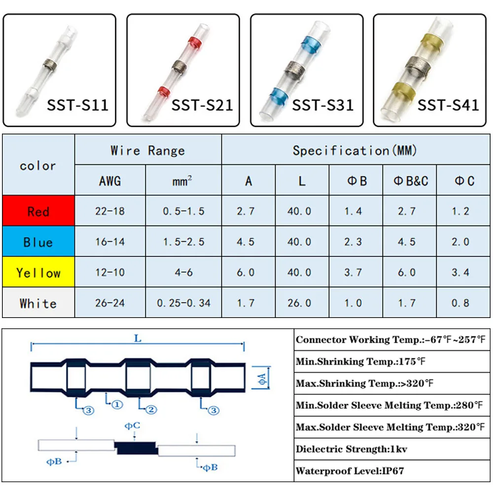 Цвета и размер: Красный СОЕДИНИТЕЛЬ: кабель костюма/размер провода 22-16 AWG 0,5-1,5 m ㎡ 35 шт синий разъем: костюм кабель/размер провода 16-12 AWG 1,5-2,5 m ㎡ 30 шт желтый разъем: костюм кабель/провод Размер 12-10 AWG 4,0 m White 10 шт белый разъем: костюм кабель/провода Размеры 26-24 AWG 0,25-0,34 м ㎡ 25 шт. ---------------------- 250 шт. ------------------------------------ Цвета & Размеры: красный разъем: Костюм кабель/размер провода 22-16 AWG 0,5-1,5 m ㎡ 35 шт синий разъем: костюм кабель/провод Размер 16-12 AWG 1,5-2,5 m ㎡ 30 шт желтый разъем: кабель костюма/размер провода 12-10 AWG 4,0 m White 10 шт белый разъем: кабель костюма/размер провода 26-24 AWG 0,25-0,34 m ㎡ 25 шт черная трубка: 150 шт. -------------------------------------------- 300 шт. цвет и размер: красный разъем: Костюм кабель/размер провода 22-16 AWG 0,5-1,5 m ㎡ 35 шт синий разъем: костюм кабель/провод Размер 16-12 AWG 1,5-2,5 m ㎡ 30 шт желтый разъем: кабель костюма/размер провода 12-10 AWG 4,0 m White 10 шт белый разъем: кабель костюма/размер провода 26-24 AWG 0,25-0,34 m ㎡ 25 шт черная трубка: 200 шт. ---------------------- 400 шт. ------------------------------------ Цвета & Размеры: красный разъем: Костюм кабель/размер провода 22-16 AWG 0,5-1,5 m 40 40 шт синий разъем: костюм кабель/провод Размер 16-12 AWG 1,5-2,5 m ㎡ 40 шт желтый разъем: кабель костюма/размер провода 12-10 AWG 4,0 m White 15 шт белый разъем: кабель костюма/размер провода 26-24 AWG 0,25-0,34 m ㎡ 30 шт черная трубка: 275 шт. ------------------------------------------- 500 шт. цвет и размер: красный разъем: Костюм кабель/размер провода 22-16 AWG 0,5-1,5 м ㎡ 50 шт синий разъем: костюм кабель/провод Размер 16-12 AWG 1,5-2,5 м ㎡ 50 шт желтый разъем: кабель костюма/размер провода 12-10 AWG 4,0 m ㎡ 20 шт белый разъем: кабель костюма/размер провода 26-24 AWG 0,25-0,34 m ㎡ 40 шт черная трубка: 340 шт. ---------------------- 600 шт. ------------------------------------ Цвета & Размеры: красный разъем: Костюм кабель/размер провода 22-16 AWG 0,5-1,5 м 60 60 шт синий разъем: костюм кабель/провод Размер 16-12 AWG 1,5-2,5 м ㎡ 60 шт желтый разъем: кабель костюма/размер провода 12-10 AWG 4,0 m ㎡ 25 шт белый разъем: кабель костюма/размер провода 26-24 AWG 0,25-0,34 m ㎡ 50 шт черная трубка: 405 шт. ---------------------- 800 шт. ------------------------------------ Цвета & Размеры: красный разъем: Костюм кабель/размер провода 22-16 AWG 0,5-1,5 m 80 80 шт синий разъем: костюм кабель/провод Размер 16-12 AWG 1,5-2,5 m ㎡ 80 шт желтый разъем: кабель костюма/размер провода 12-10 AWG 4,0 m White 35 шт белый разъем: кабель костюма/размер провода 26-24 AWG 0,25-0,34 m 70 70 шт черная трубка: 535 шт температура: рабочая температура до 200 ℃ -55 ℃ ~ 125 ℃ Минимальная термоусадочная температура: 60 ℃ начальная температура припоя расплава: 138 ℃ температура полного припоя melt160 ℃ Цвет: красный, синий, белый, желтый, черный