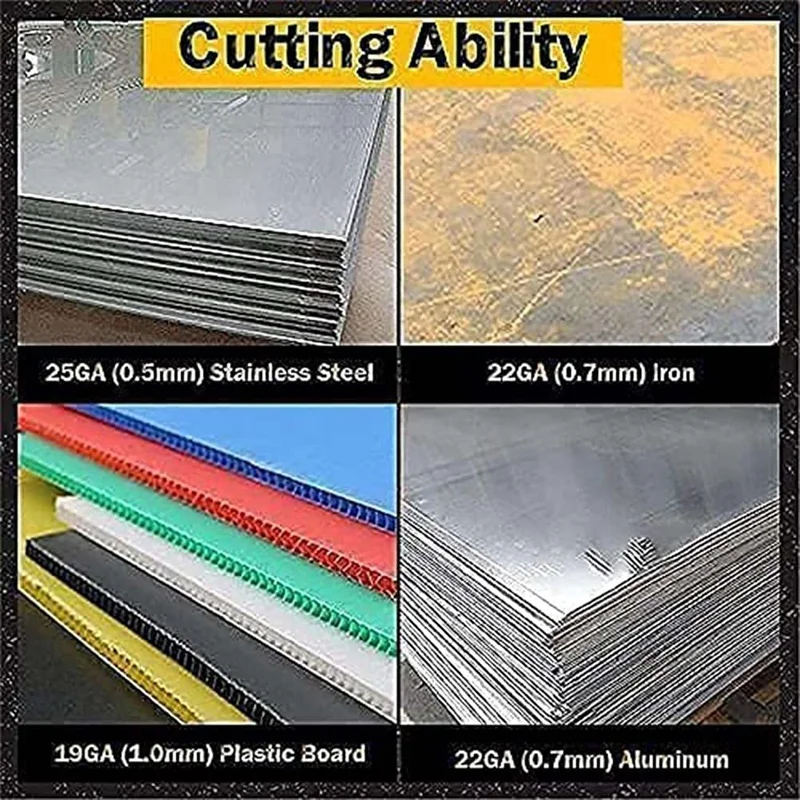 [Быстрой резак для металлических пластин] он может быстро нарезать 25GA (0,5 мм) Нержавеющая сталь, 22GA (0,7 мм) железа, меди, алюминия, металлическая сетка, и даже 19GA (1,0mm) пластиковые доски, FRP волокна, ПВХ доска, картон и другие жесткие доски. Чем больше материал, тем легче его использовать.