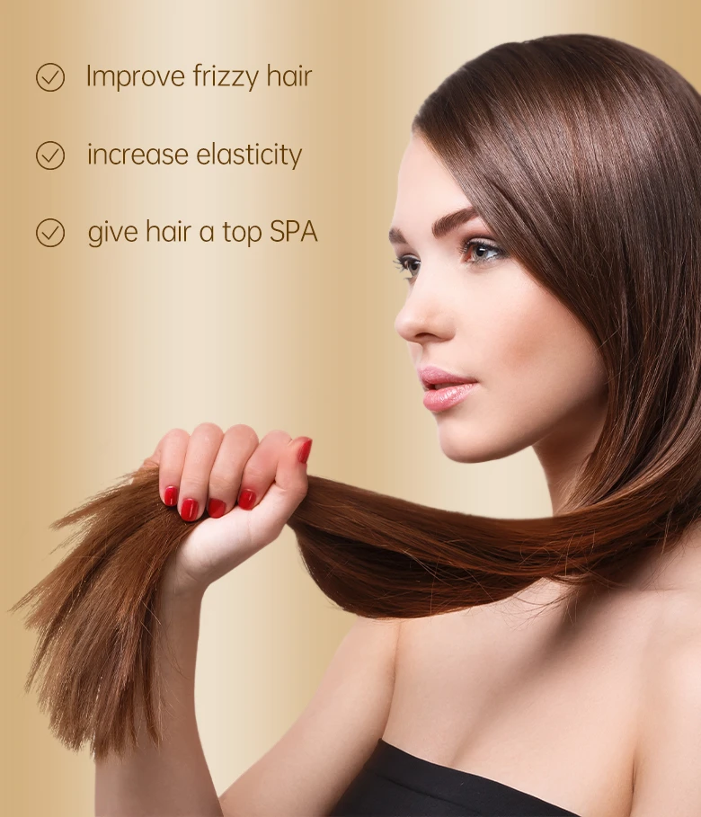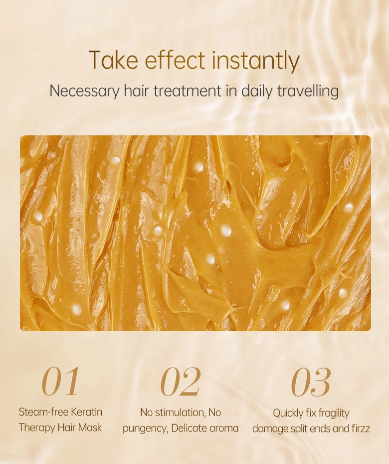 Кератин является важным компонентом для роста волос, и он высоко концентрируется в каждой грануле в кератиновой терапии Маска для волос. Во время пребывания на волосах эта маска для волос может пополнять питание, чтобы заполнить empties и трещины, вызванные внешними повреждениями, такими как сухая и Загрязненная среда, солнце подвергать или частые укладки, улучшение хрупких волос и уменьшение ломкости волос. Впитывая достаточно коллагена для роста, волосы станут крепкими и эластичными с большей блеском и меньшим секущимся концом.