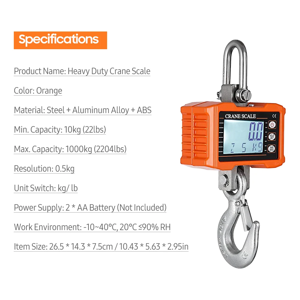 Сверхмощный крановые весы-максимальная 1000 кг (2204lb) и не менее 10 кг (22lbs) несущую способность, 0,5 кг. Подходит для пищевой/стальной промышленности, строительной площадки, наружной работы и т. д.