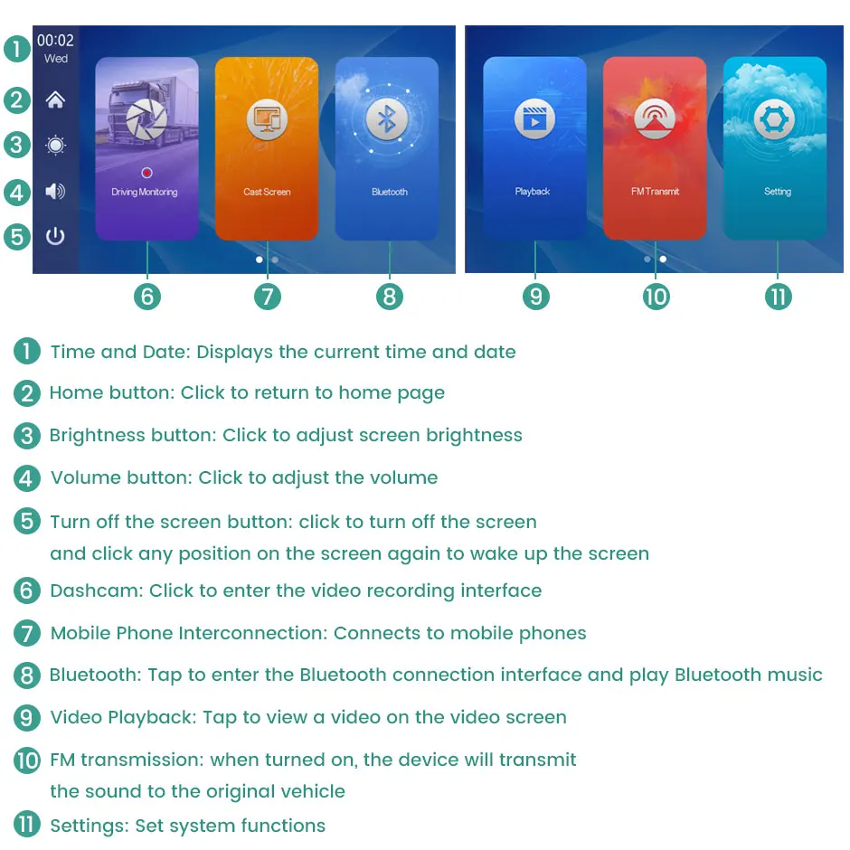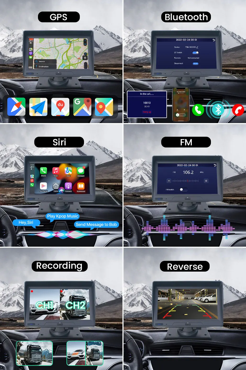 • Поддержка Carplay и Android Auto, GPS, Bluetooth для воспроизведения музыки, fm-передачи, подключение к автомобильному радио, выберите обувь на 1/3/5/8/24 часов видео наблюдения, максимальная поддержка карты TF 256 ГБ.