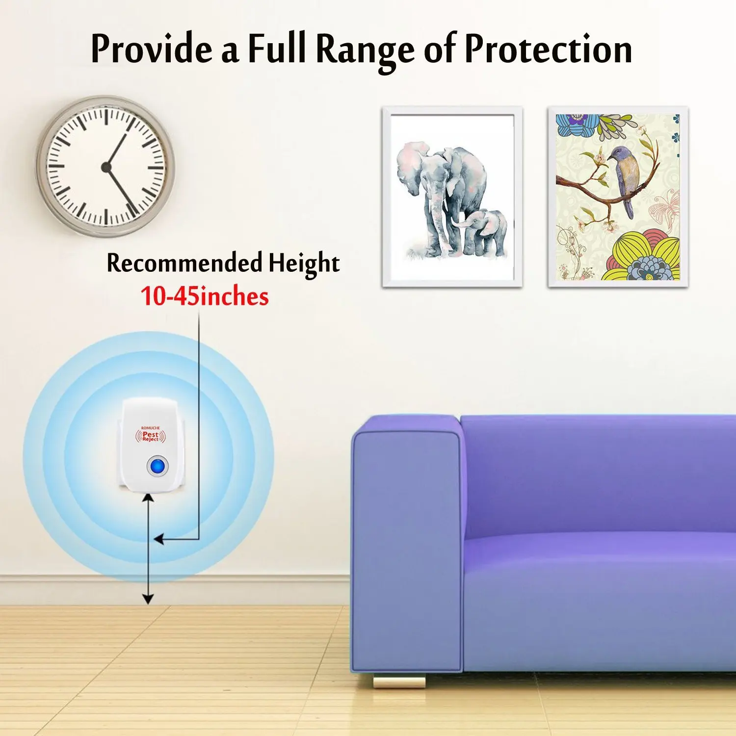 Работает путем непрерывной передачи мощного диапазона ультразвуковых звуковых волн, которые изгоняют вредителей.