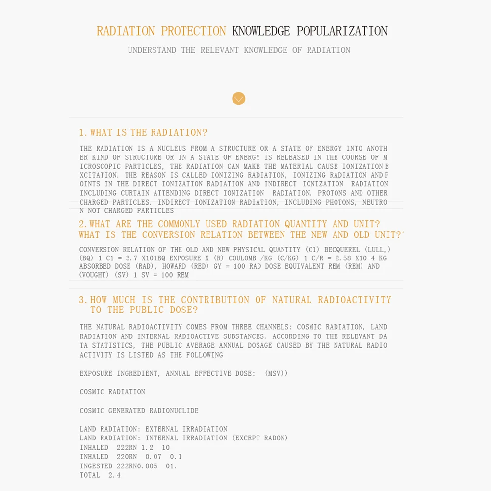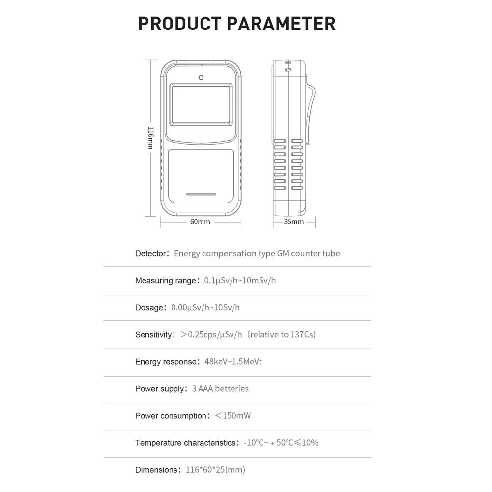 Различные функции экрана:Вы можете настроить значение считывания сигнала тревоги, переключение на китайский и английский языки, подсветку экрана, функцию отображения скорости дозы в реальном времени и так далее в соответствии с вашими потребностями.
