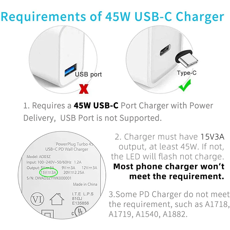 Microsoft Surface Pro 3/4/5/6: 45 Вт PD (15V/3A) или большее количество