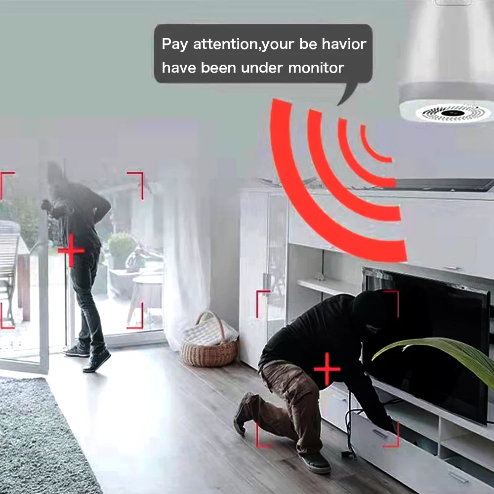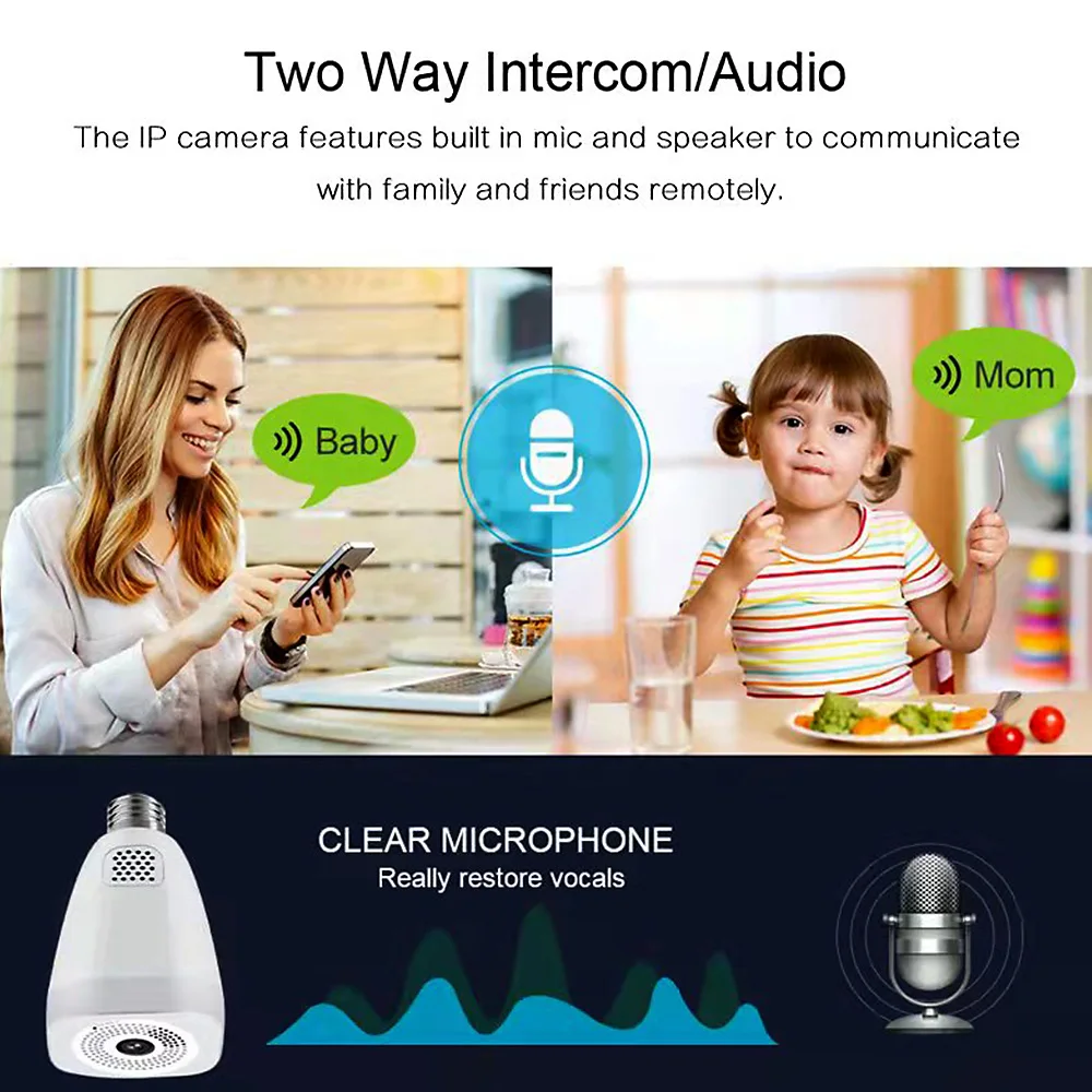 3MP иПанорамный просмотр:Эта ламповая камера может предоставить вам четкое видение в любое время. Вы можете использовать приложение для управления камерой, чтобы достичь 360 просмотра без слепых зон.