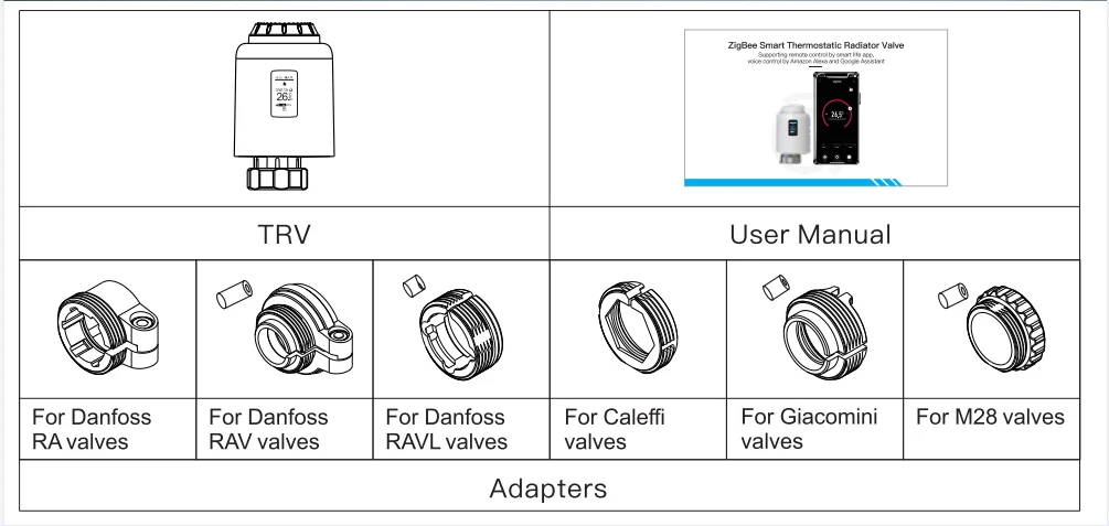 TRV-603 совместим практически со всеми Термостатическими клапанами радиатора от большинства производителей. В посылка входит несколько адаптеров.