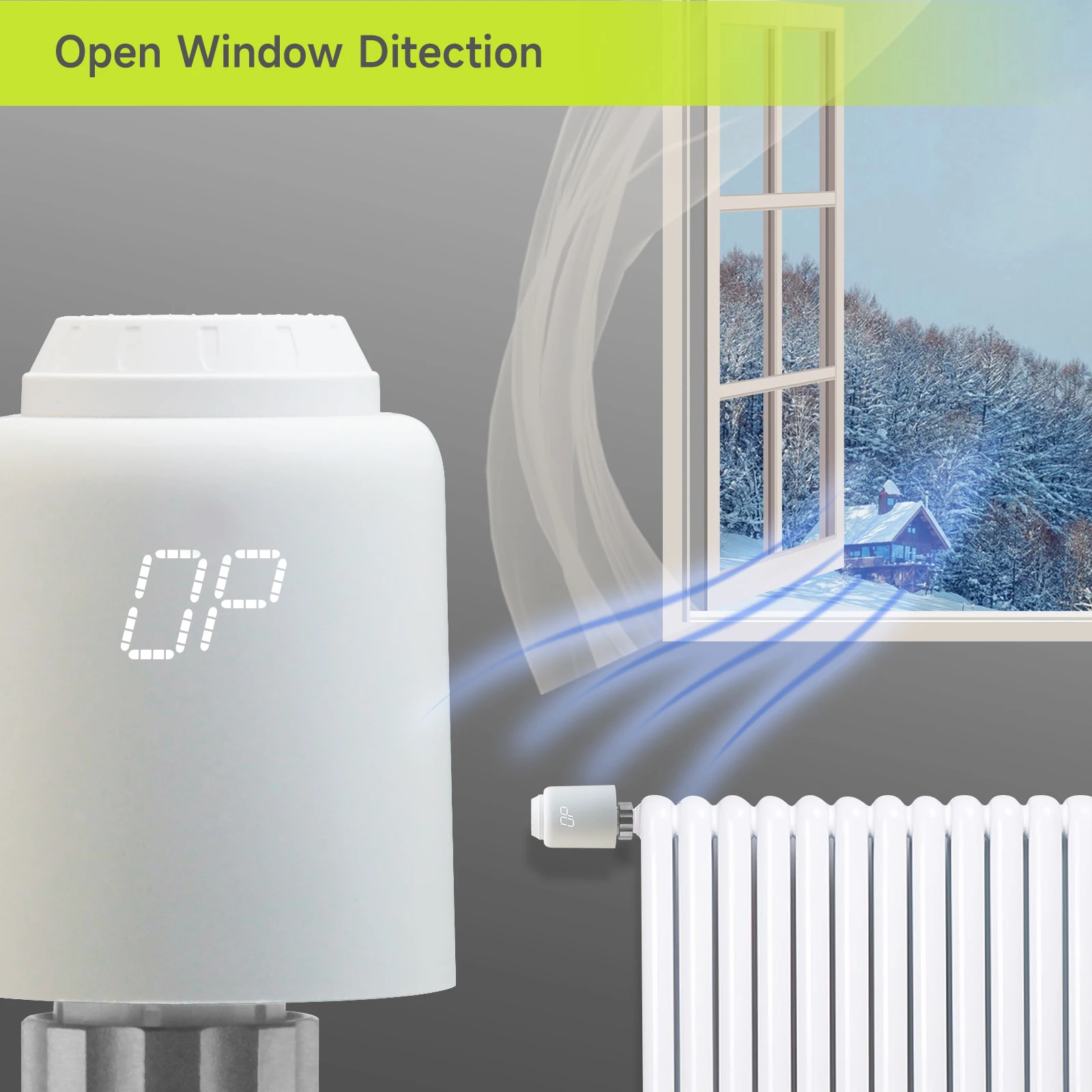 Термостат радиатора обнаруживает открытые окна и отключает нагрев, чтобы сэкономить больше энергии.