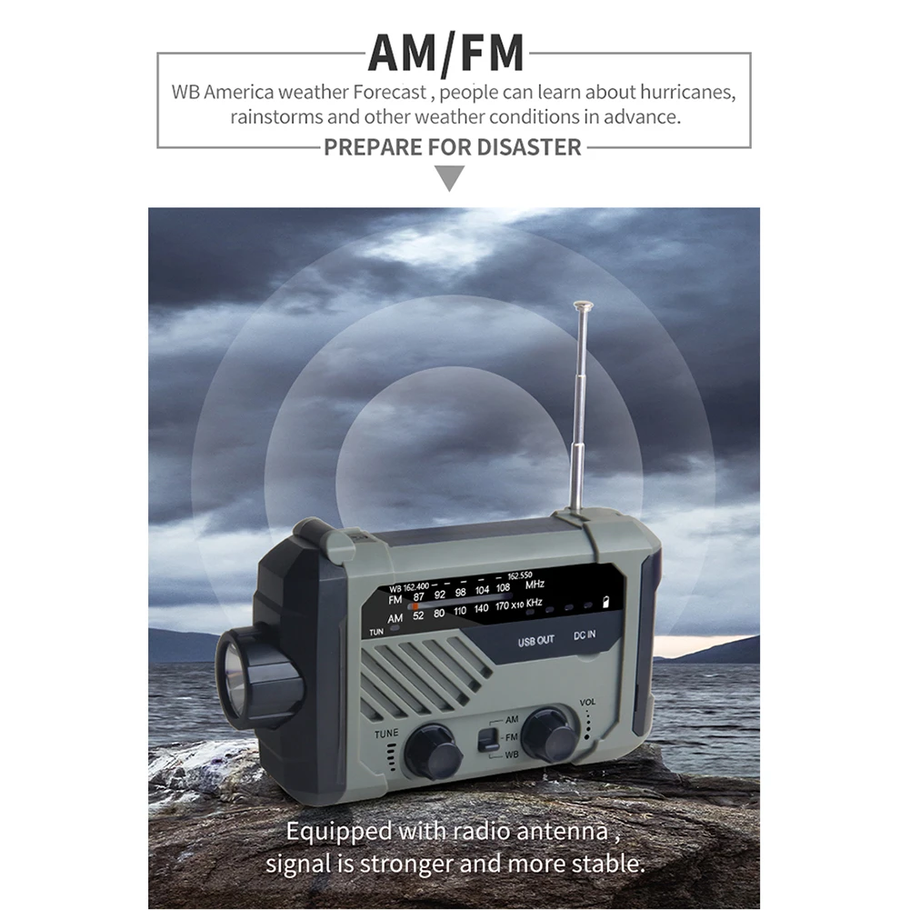 Emergency power supply: The handheld weather radio has a built-in 2000mAh power supply, which can provide emergency power supply for mobile devices such as smartphones, GPS devices, and mp3 players. It keeps you online at home, in the office or outdoors and avoids losing contact in an emergency.