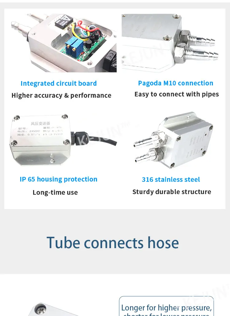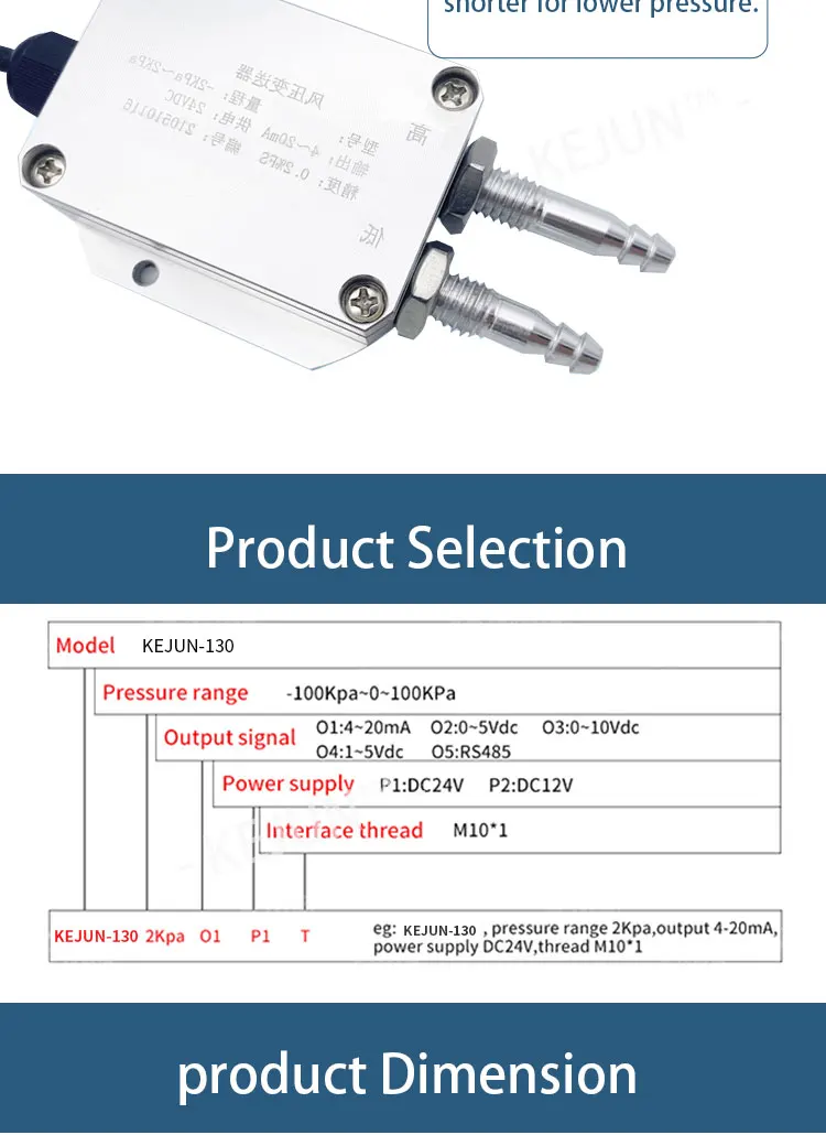 1>. KEJUN-130 Преобразователь перепада давления воздуха состоит из высококачественного кремниевого пьезорезистивного сердечника перепада давления и корпуса из алюминиевого сплава, с 2 интерфейсами давления с резьбой M8 и петлевой структурой. Его можно сразу установить в измеряя трубопроводе или соединить через трубу ракеты-носителя, и может точно измерить давление и перепад давления газа.