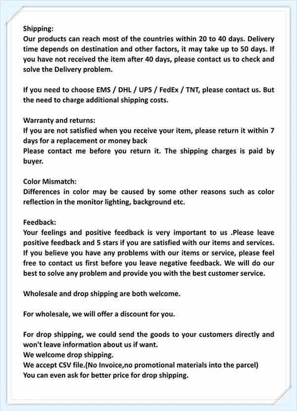 Если вы хотите купить больше, пожалуйста, свяжитесь со службой поддержки клиентов для получения скидки! Добро пожаловать в оптовую торговую компанию, чтобы забрать товары!