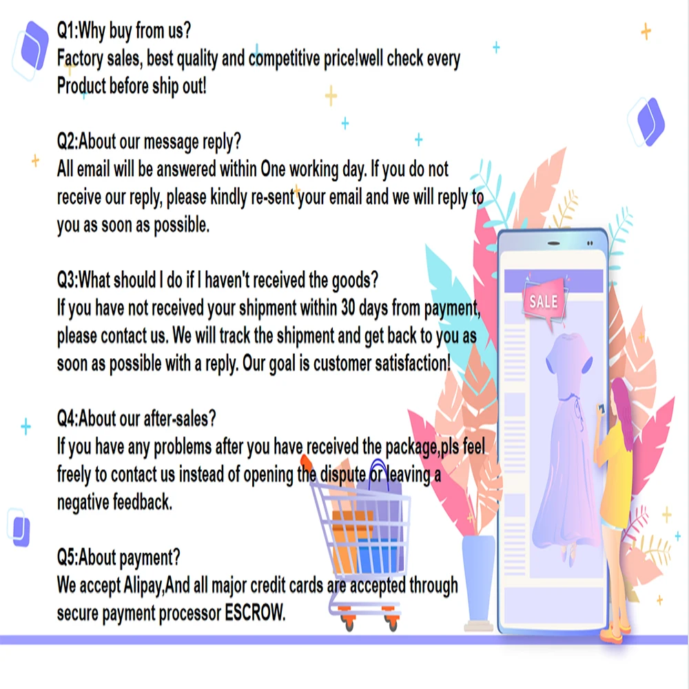 1. Мы принимаем Alipay, и все основные кредитные карты принимаются через безопасный платежный процессор ESCROW.