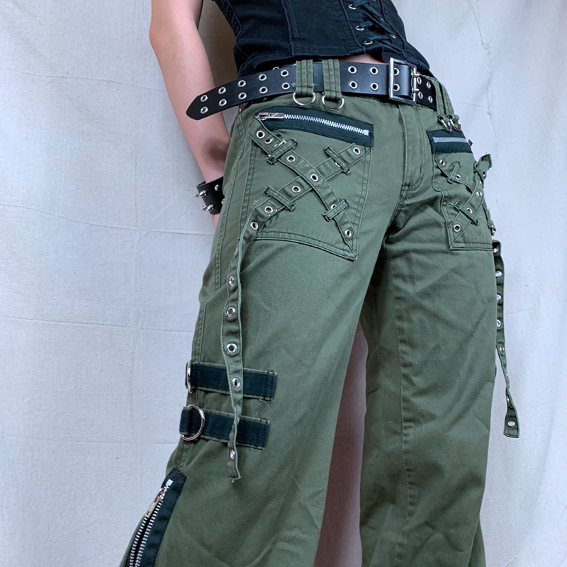Женские брюки, готические, панк, мешковатые, винтажные, Kawaii, брюки с низкой талией, брюки-карго, гранж, зеленые джинсы на молнии, корейские спортивные штаны