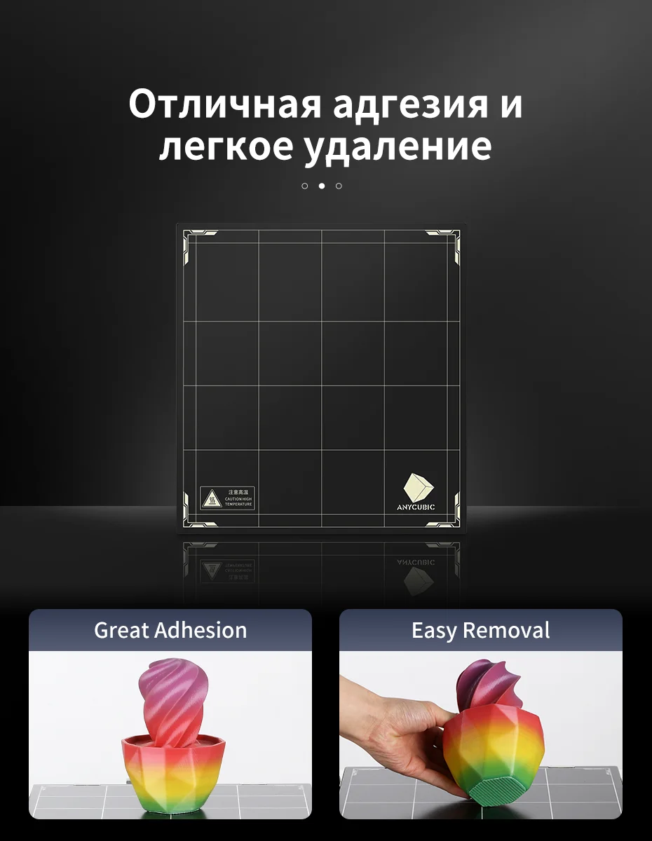 Печатная кровать фиксирует части вниз во время печати, когда жарко, и после охлаждения части могут быть легко сняты. Он может быть использован повторно без потери производительности.