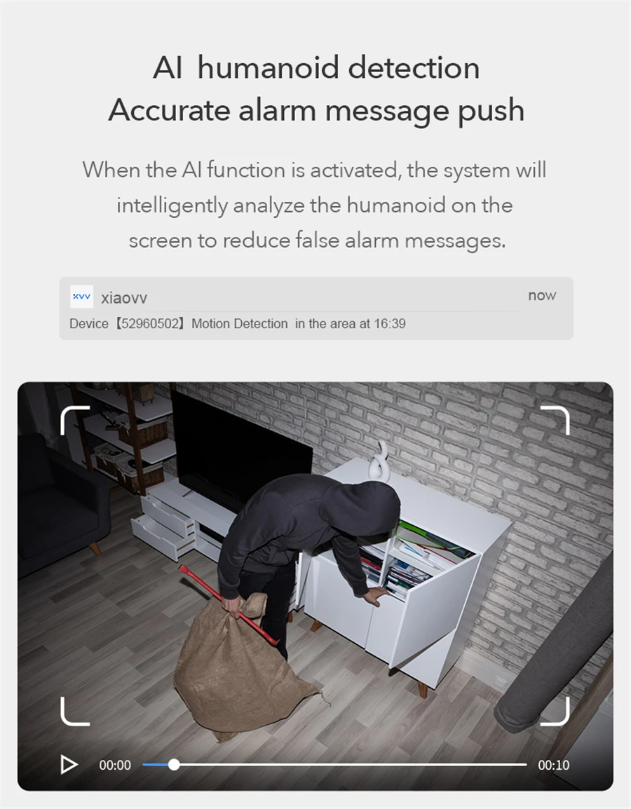 Включите Интеллектуальное обнаружение активности, и вы можете установить эффективную область. При обнаружении объекта, сигнал высокого децибел будет звучать немедленно, чтобы отпугивать нарушителей и мгновенно нажимать сообщения на телефон.
