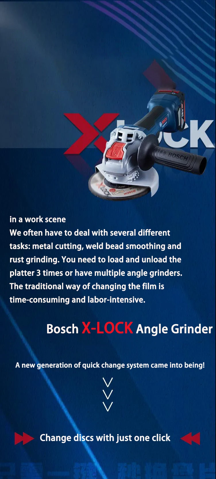 Bosch X-LOCK угловая шлифовальная машина преимущество: 1. Замените диски одним щелчком