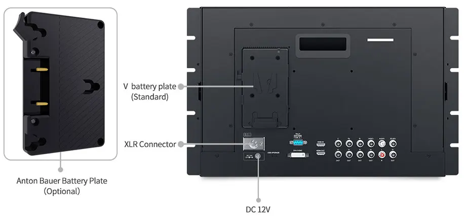 We've made it easy to power the monitor. P173-9HSD-RM can be powered in two ways: with an DC adapter or lithium batteries. The P173-9HSD-RM has a flexible battery system that supports V battery plate (standard), Anton Bauer battery plate of your choice.