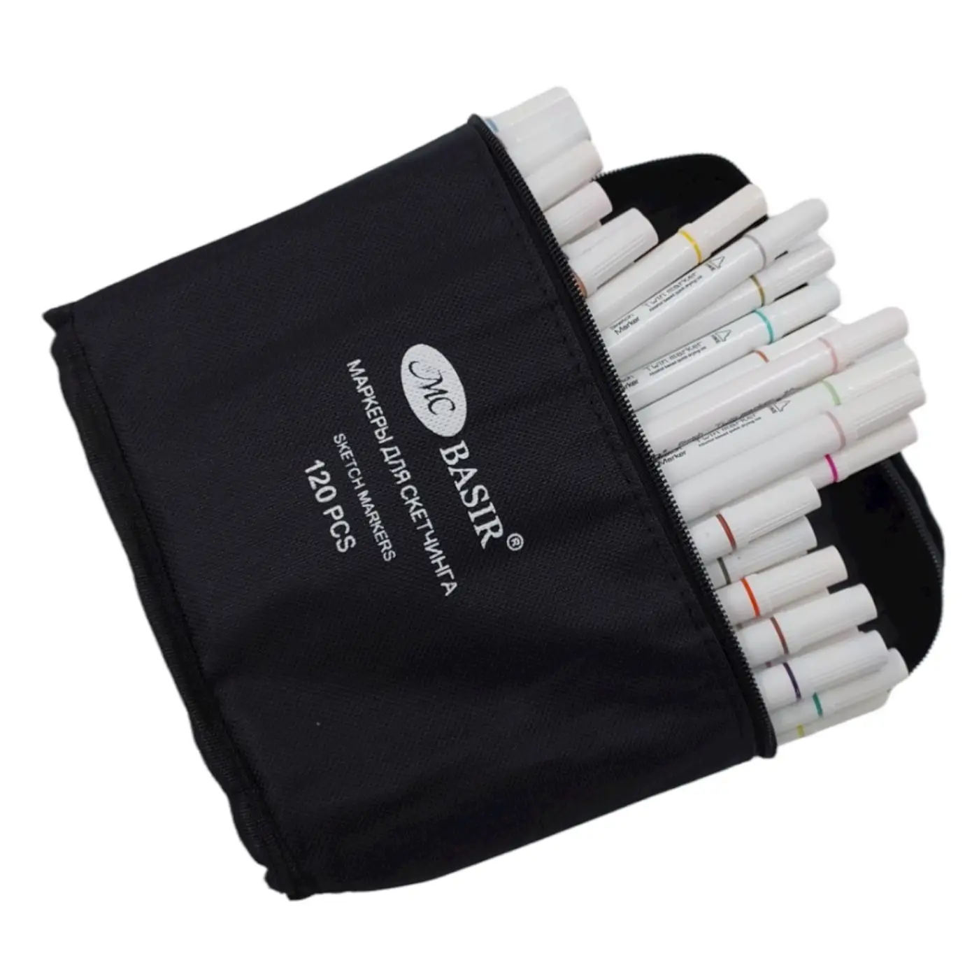 Набор скетчмаркеров: двусторонние - пулевидный и клиновидный наконечники, ширина линии письма 1,0-7,0 mm; белый корпус; чернила на спиртовой основе; тканевая чёрная сумка на молнии