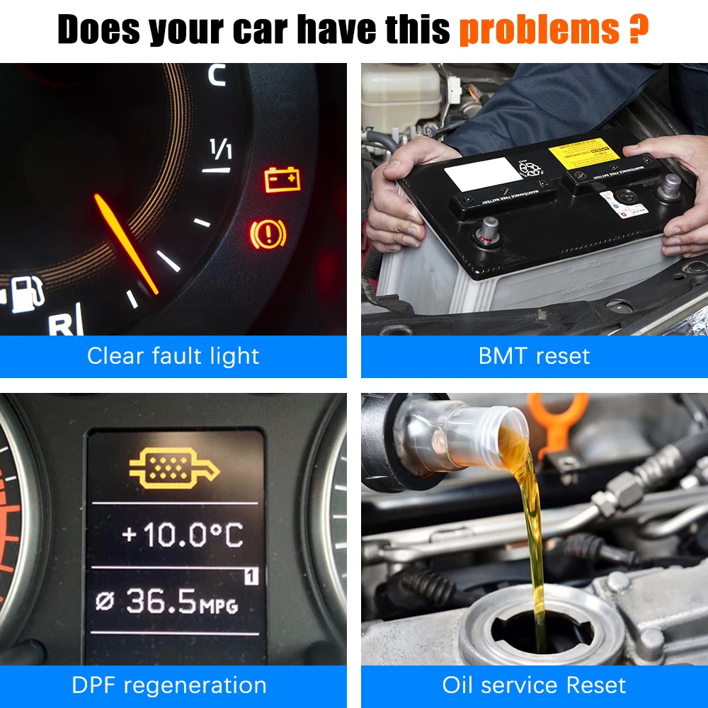 GT60 автомобильный диагностический сканер может выполнять 24 + наиболее часто используемые горячие функции/основные услуги: сброс масла, EPB, калибровка SAS, TPS, регенерация DPF, замена батареи, адаптация передачи, кровотечение ABS, топливный насос, Кодирование инжектора, адаптация сцепления, передача обучения, CVT и т. Д. Обратите внимание: Доступные функции могут отличаться в зависимости от года, модели и изготовления испытательного транспортного средства. Для проверки совместимости, пожалуйста, пришлите нам номер автомобиля