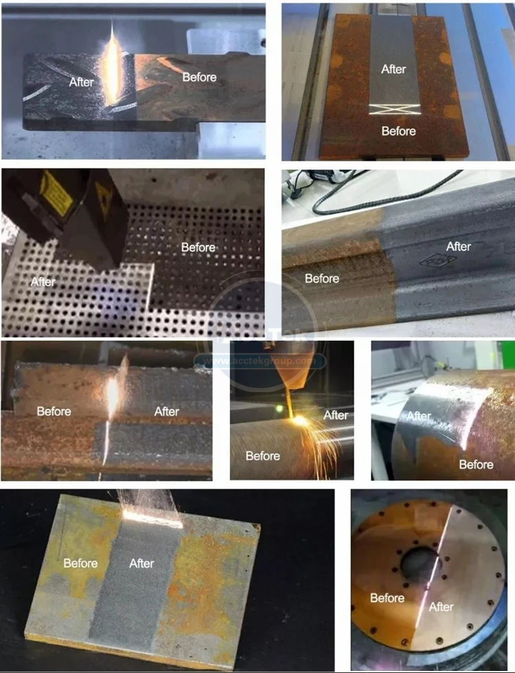 Волоконно-Лазерная Очистительная Машина имеет хороший чистящий эффект на железе, пластине из углеродистой стали, пластине из нержавеющей стали, стальной шестерне, алюминиевой пластине, лакокрасочном слое и других материалах.