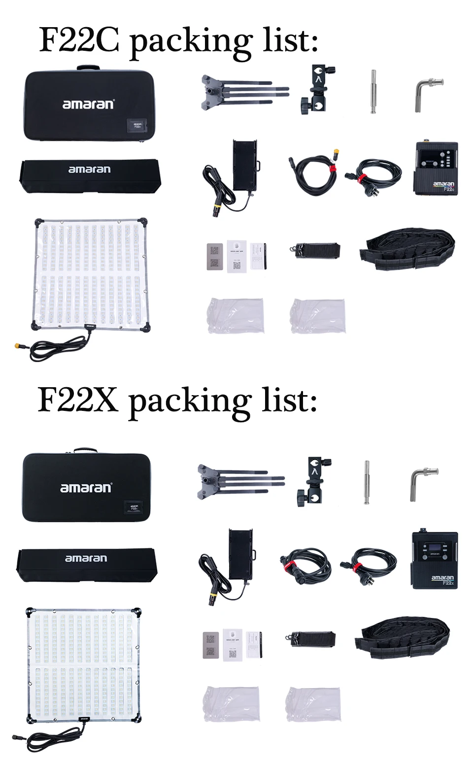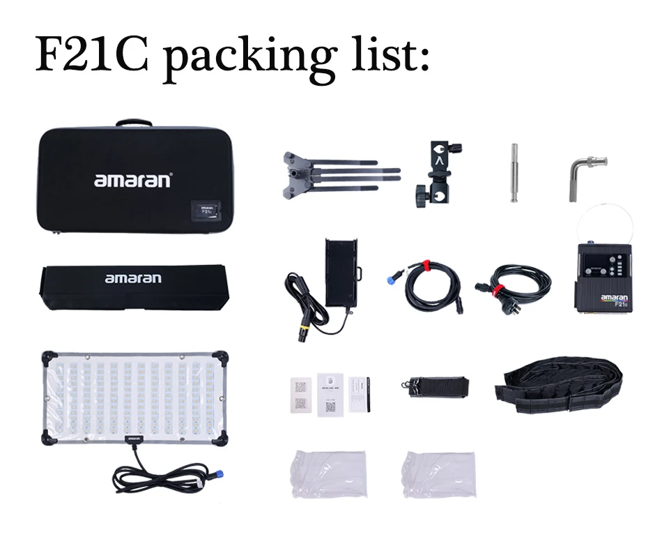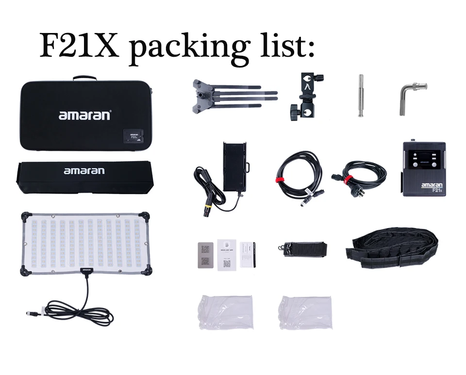 Aputure Amaran F22X/F22C/F21C/F21X RGBWW полноцветный видео светильник гибкий светодиодный светильник 2500-7500K Аксессуары для фотосъемки Особенности: Корпус лампы имеет четырехслойную защитную конструкцию, корпус лампы мягкий и совместимый и имеет превосходное сопротивление изгибу. Его можно сложить и использовать, что идеально подходит для всех видов Стандартная Монтажная поверхность Весь гибкая схема + высокая светильник с высоким коэффициентом пропускания ТПУ материал поверхностный слой используется для того, чтобы создать очень высокий светильник выход консистенции, и светильник выход для лучшего эффекта выбирайте Небольшие отверстия по всему корпусу предназначены для облегчения использования кабельных стяжек для установки и фиксации корпуса лампы, а также могут использоваться для укрепления связи между лампами при соединении нескольких ламп Четыре угла корпуса лампы спроектированы с пластиковыми блоками давления + двойной противоскользящей штангой на липучке, которая более стабильна и надежна при использовании опорной рамы в форме х Сверхдлинный провод, чтобы удовлетворить потребности в дальнем освещении Упаковочный лист: Гибкая лампа * 1 Удлинитель корпуса лампы (3 метра) * 1 Блок управления * 1 Адаптер питания DC кабель (3 метра) * 1 Адаптер переменного тока (4 м) * 1 X-образная Опора * 1 Опорная Колонка рулевого управления (включая опорную колонку A, B)* 1 Набор софтбоксов (софтбокс * 1, мягкая ткань * 2, решетка * 1)* 1 Ремешок для сумки * 1