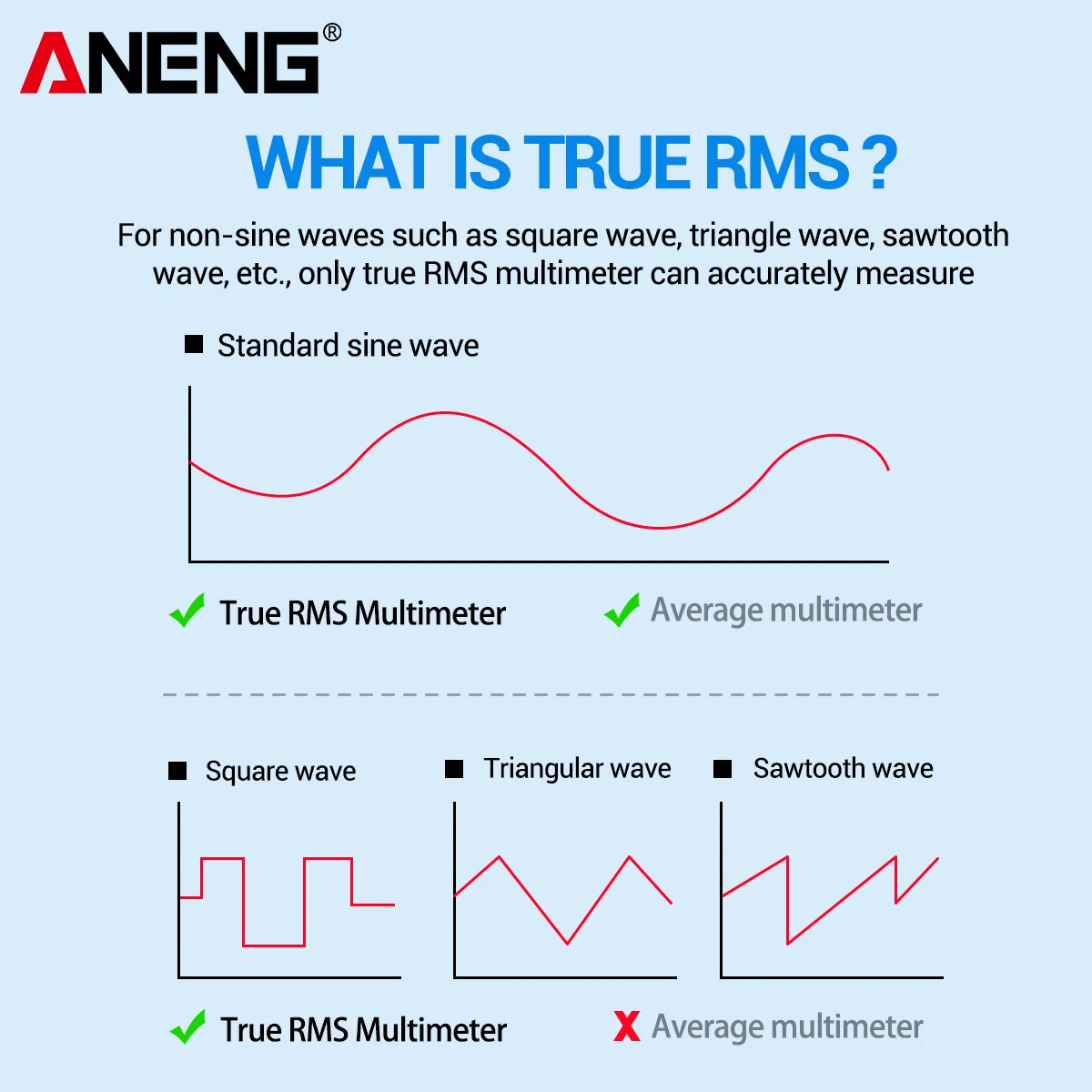 Карманный мультиметр ANENG отличается размером ладони, большим ЖК-дисплеем 4,77 дюйма, автоматическим диапазоном, истинным RMS, защитой от перегрузки, противоударным силиконовым покрытием и звуковым сигналом NCV. Он является ультрапортативным для обслуживания автомобилей, электроники, бытовой техники, ОВКВ и многого другого.