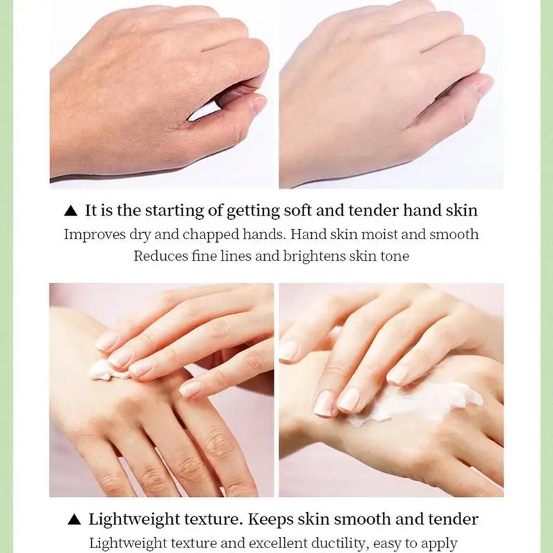 Эффективность продукта: богатая кремовая текстура элегантно обертывает кожу рук, ощущая себя как маска для рук, увлажняет, питает, восстанавливает и защищает. Мягко восстанавливает сухой, твердый, толстый ручной кератин, грубые морщины рук и тонкие линии, оставляет кожу сияющей и питающей, и устраняет тонкие линии и мозоли между костяшками пальцев