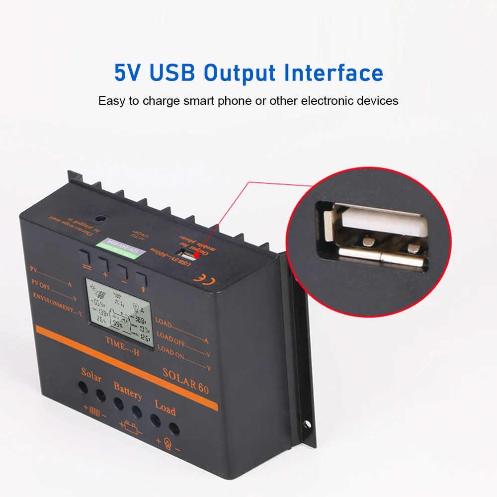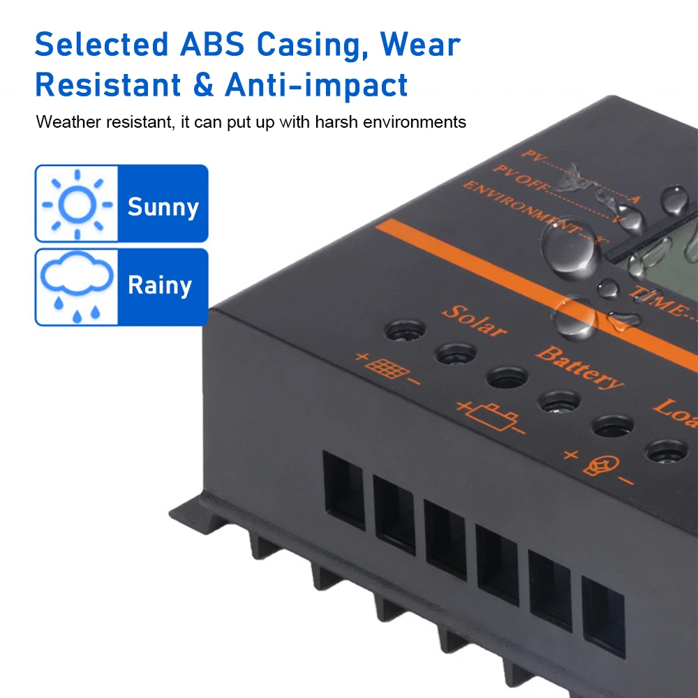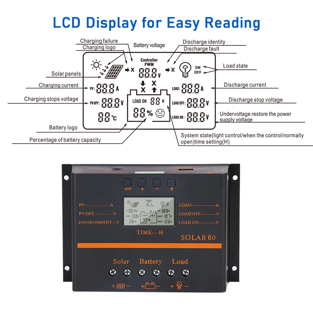 Automatic identification for system voltage: 12V/ 24V. The solar controller is suitable for various specifications of solar panel, applicable to both home and commercial use.