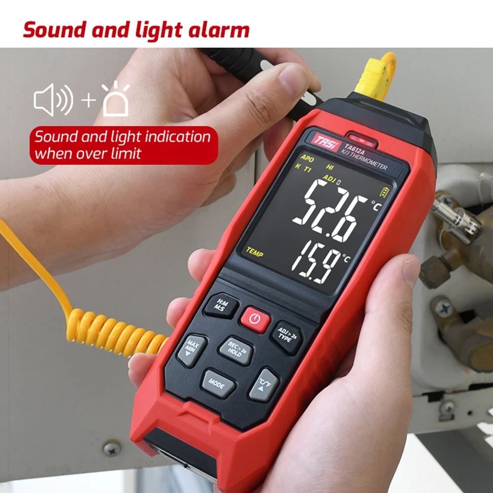 Портативный цифровой термометр может быть подключен к термопаре типа K/ J для измерения температуры. Он оснащен цифровым цветным дисплеем VA, функцией удержания данных, максимальными/минимальными значениями, хранилищем данных, будильником, автоматическим выключением и большим количеством функций для удобного и удобного использования.