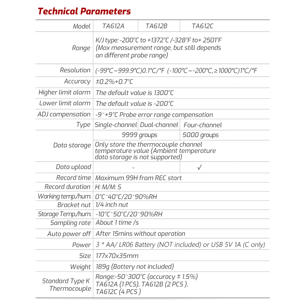 Цифровой цветной дисплей VA для удобного чтения. Функция удержания данных, максимальное/минимальное значение. И только C имеет интерфейс USB и поддерживает загрузку данных и измерение в реальном времени.