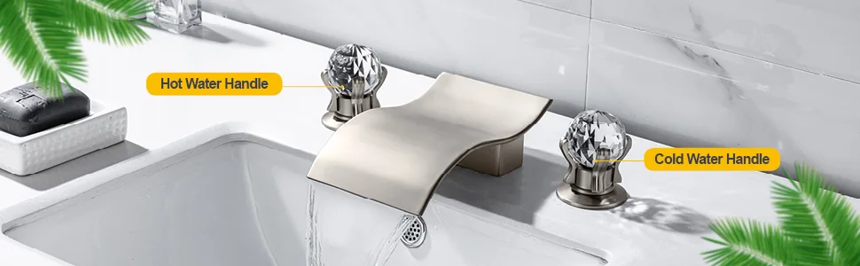 The bathroom faucet with two crystal handles and wide mount waterfall spout are in line with modern design aesthetic which highly enhance the class of your bathroom. The wide waterfall spout delivers a gentle sheet of laminar water and provides you the most comfortable washing experience. Crystal handle is the ornament that elevates the class of your bathroom.