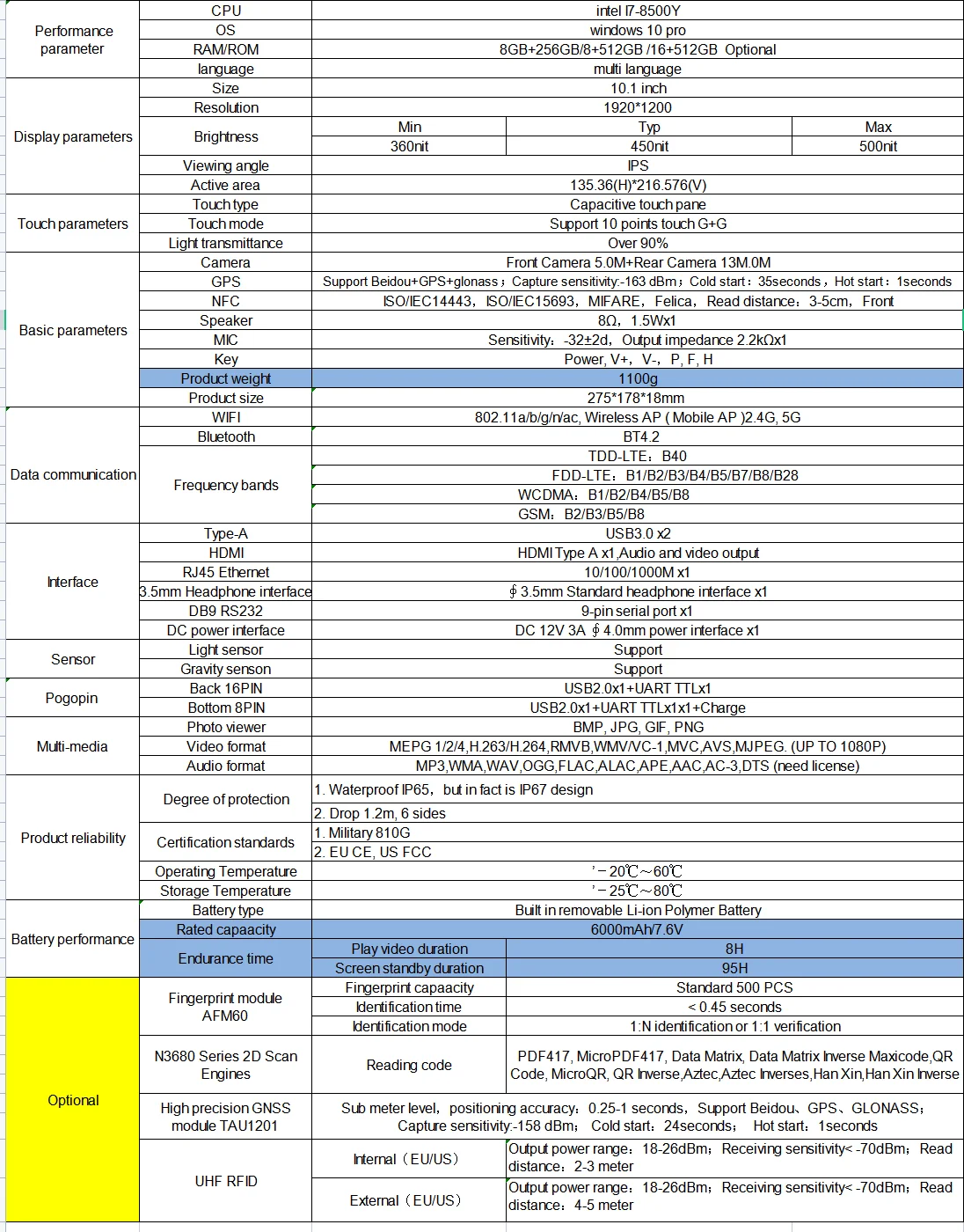 2D штрих-кода (сканер штрих-кода honeywell N3680),LF 125 кГц, UHF 3-4 метра, отпечаток пальцев, высокая точность GPS по желанию (точность 0,25-1 метр)