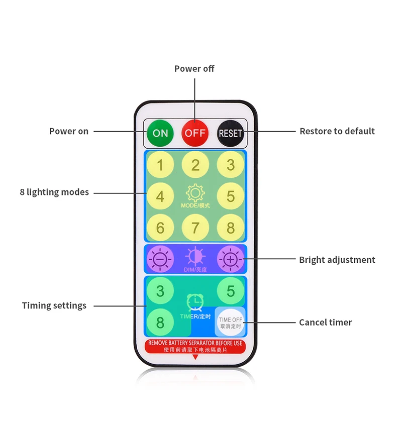 【Многофункциональный пульт дистанционного управления: 17 клавиш радиочастотного дистанционного управления имеют 8 различных кнопок; Яркая модель (яркость-/яркость +); Режимы таймера (3 часа ВКЛ./5 часов/8 часов вкл.). Вы можете выбрать режим для удовлетворения ваших различных сцен