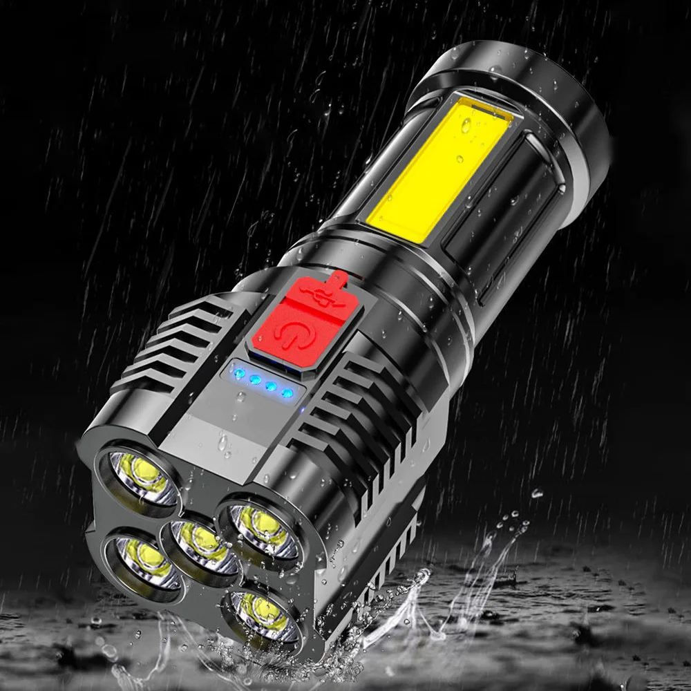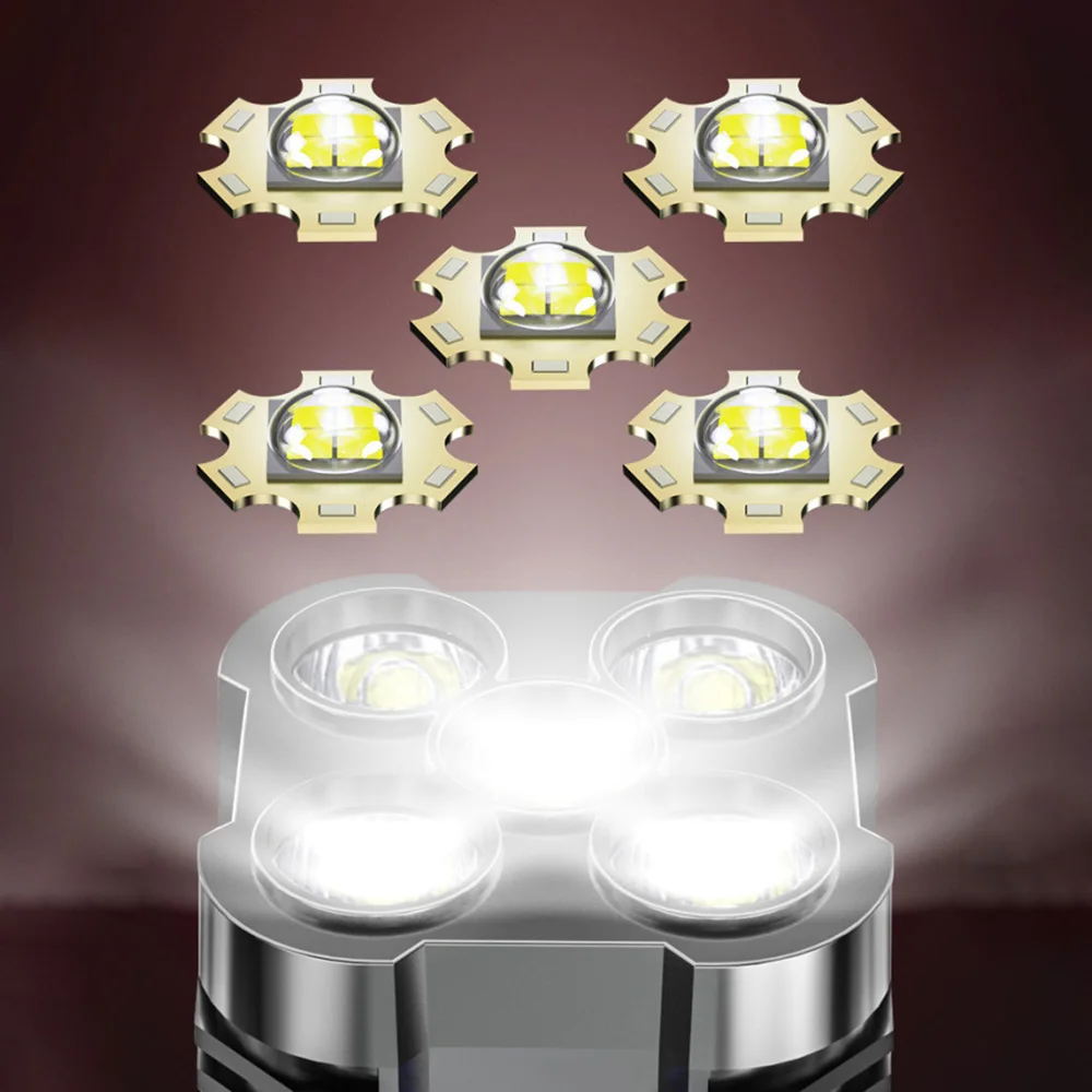 2. Лампы: пять модернизированных ламп высокой яркости и режим матричной структуры значительно улучшают яркость фонарика, с сильным пультом дистанционного управления, высокой мощностью и долгим сроком службы, которые могут удовлетворить ваши различные потребности в освещении.