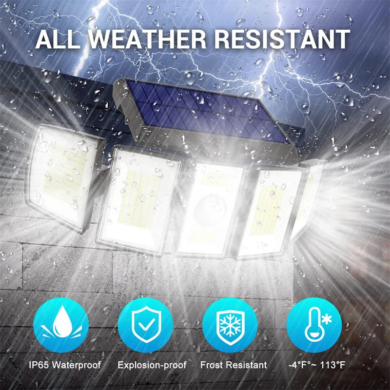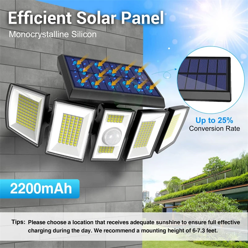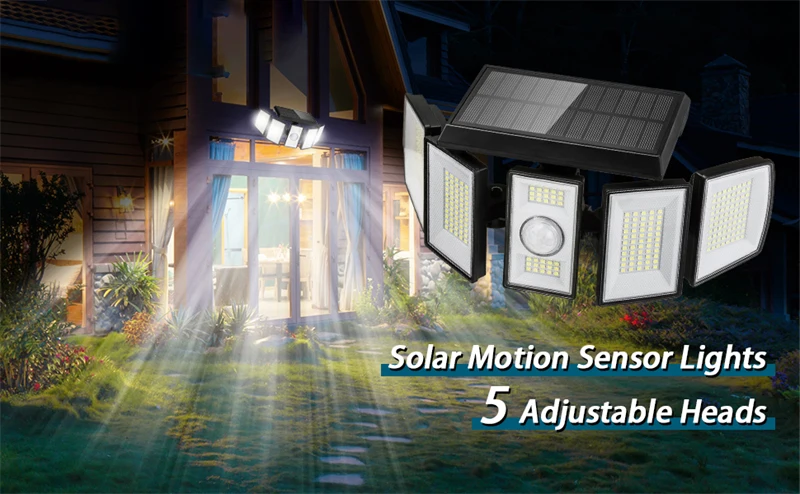 5 головок, 360 ° регулируемые солнечные наружные огни: наш светодиодный светильник имеет 5 головок, другие солнечные огни имеют только 3 головки. Головки можно регулировать по желанию, широкоугольное освещение для удовлетворения различных потребностей. Широкий диапазон освещения до 1000 кв. футов, отлично подходит для вашего двора, крыльца, гаражного прохода и обеспечивает вам и вашей семье безопасную среду ночью.