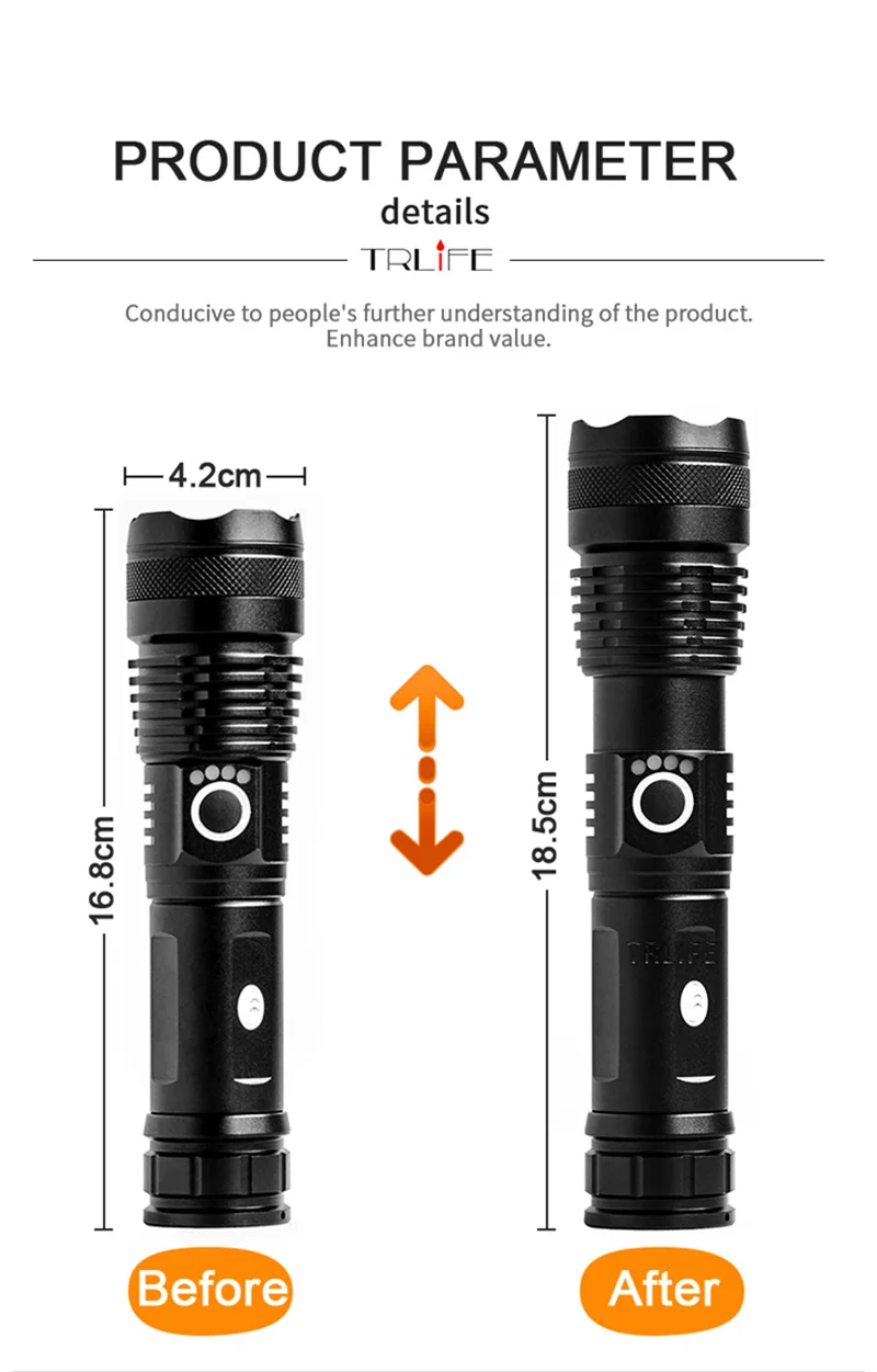 ※Мы обращаем внимание на качество и обновление продукции. Предоставление клиентам новейших и высококачественных продуктов-это наш принцип обслуживания. Поэтому мы разработали фитиль XHP360 для этого фонарика. Это самый мощный и Яркий фитиль в AliExpress. Используйте 1*18650 или 1*26650 аккумулятор, 18650