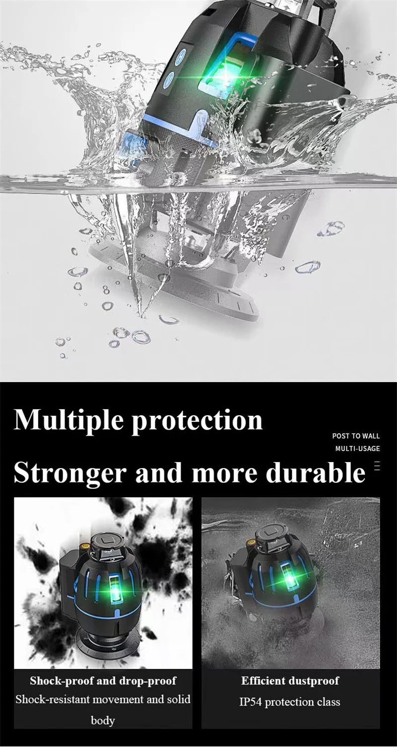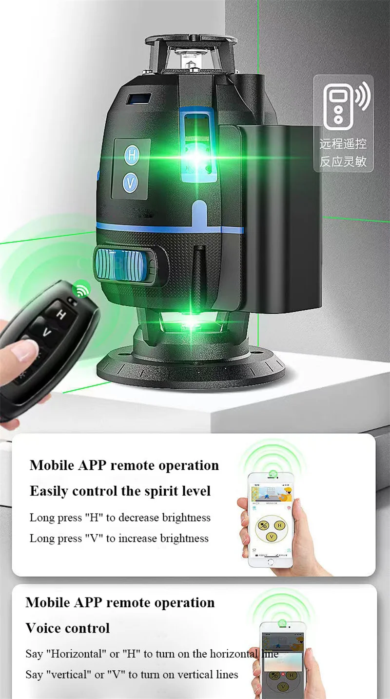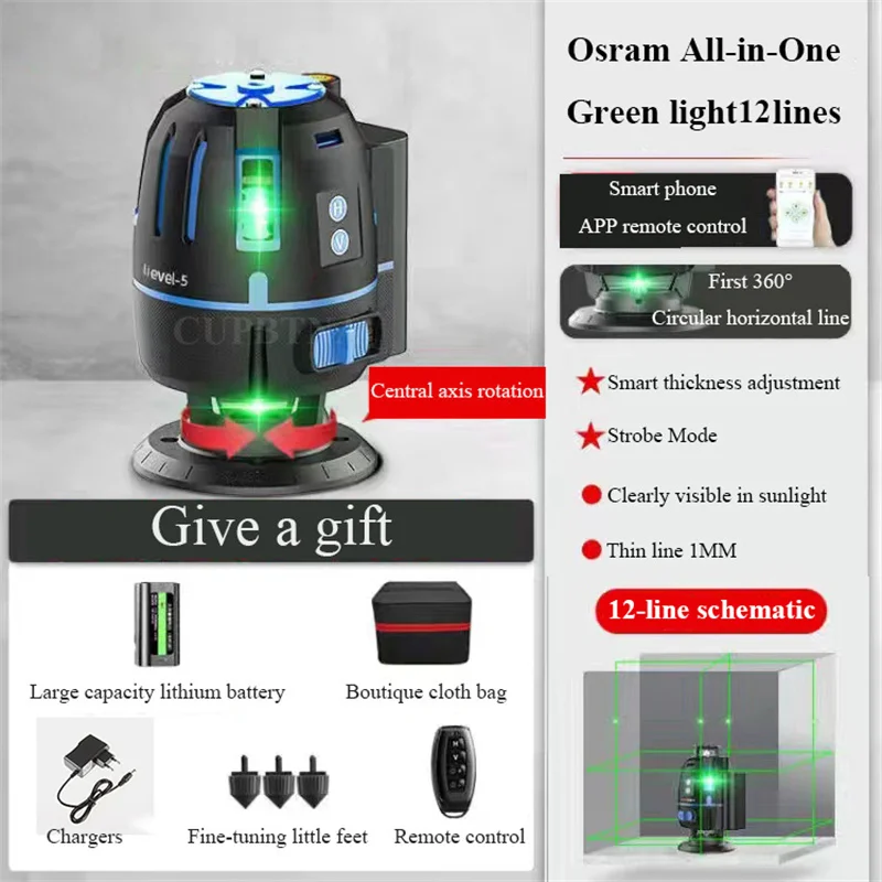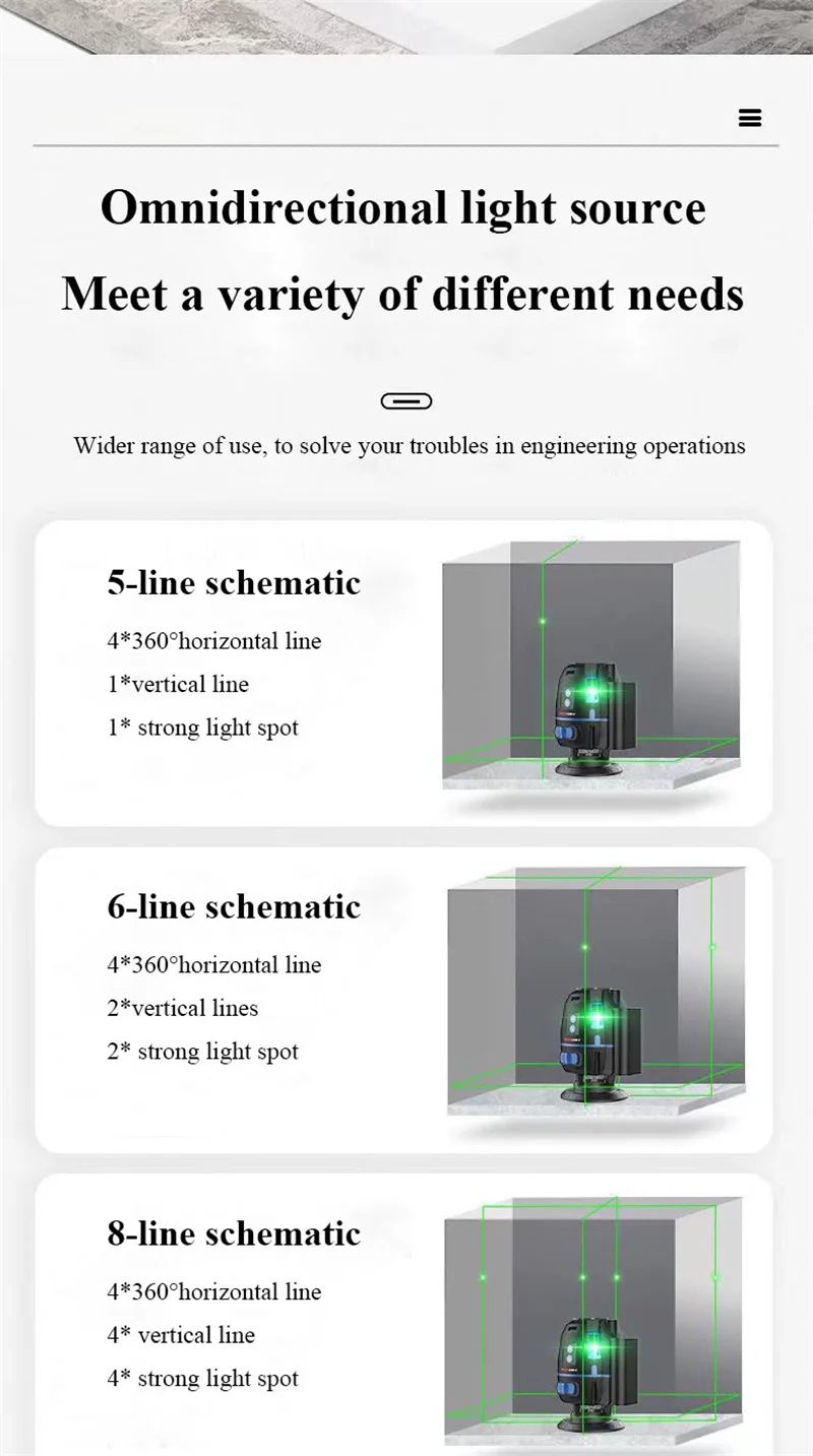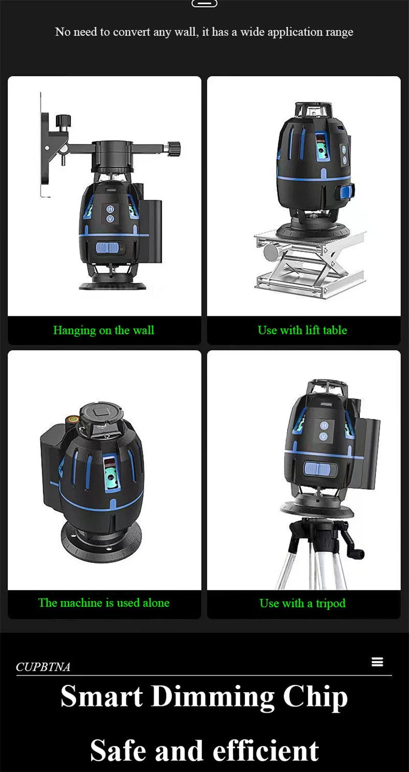 Этот продукт не совместим с другими лазерными уровнями 5/6/8/12. Наши продукты могут быть 2/3/5 линий, прикрепленных к стене и земле для точной работы. Продукт принимает восьмое поколение LD smart chip, импортированный из Германии и Osram светильник-источник. Лазер, проецируемый импортной лазерной головкой, ярче и более проникает и хорошо виден в помещении и на открытом воздухе. Его можно использовать с штативом для диагональной работы в любое время и в любом месте.