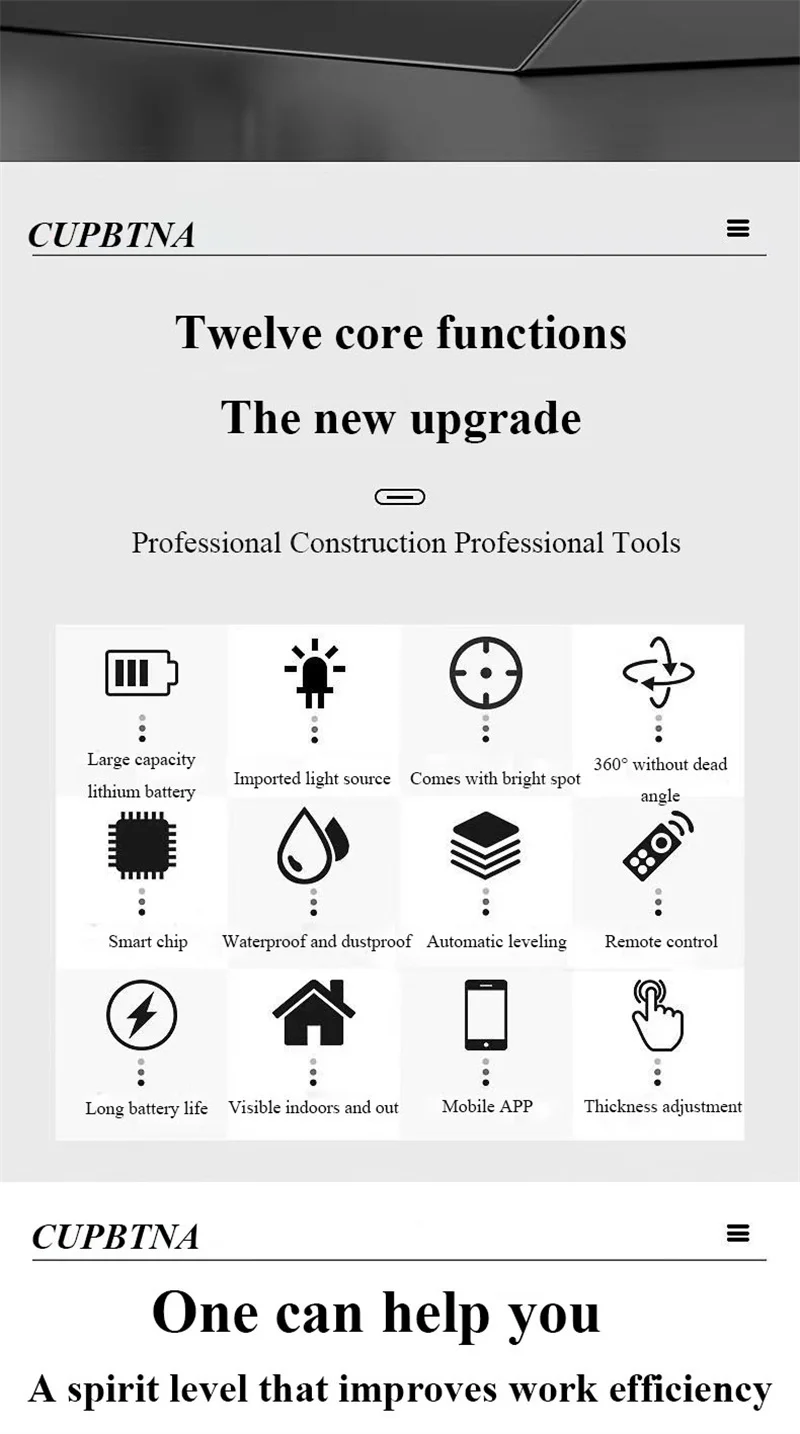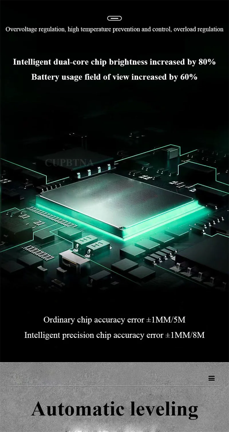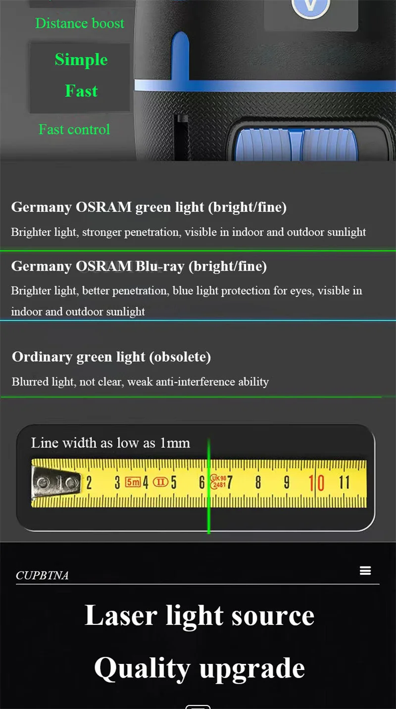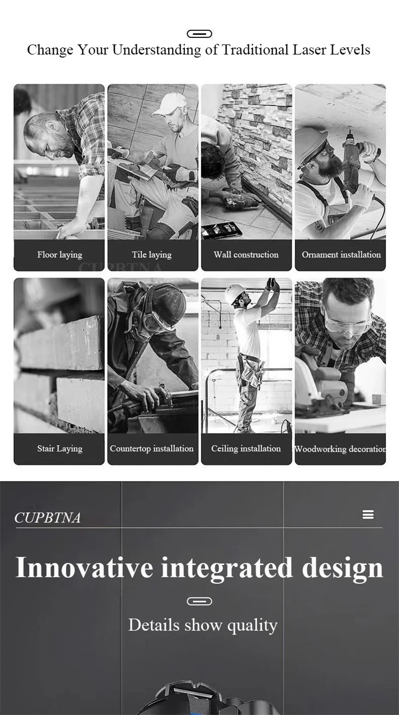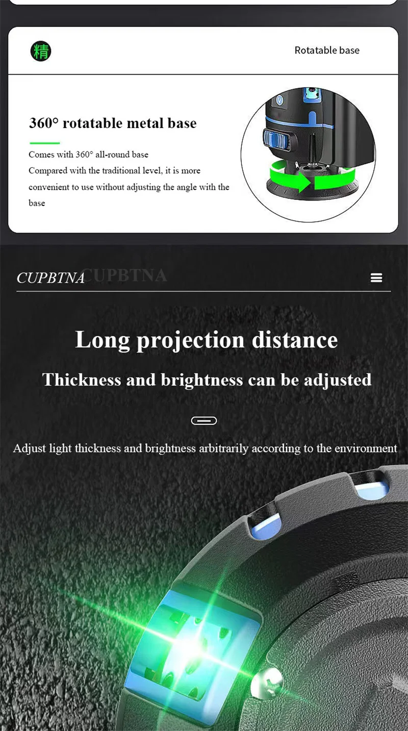 Этот продукт не совместим с другими лазерными уровнями 5/6/8/12. Наши продукты могут быть 2/3/5 линий, прикрепленных к стене и земле для точной работы. Продукт принимает восьмое поколение LD smart chip, импортированный из Германии и Osram светильник-источник. Лазер, проецируемый импортной лазерной головкой, ярче и более проникает и хорошо виден в помещении и на открытом воздухе. Его можно использовать с штативом для диагональной работы в любое время и в любом месте.