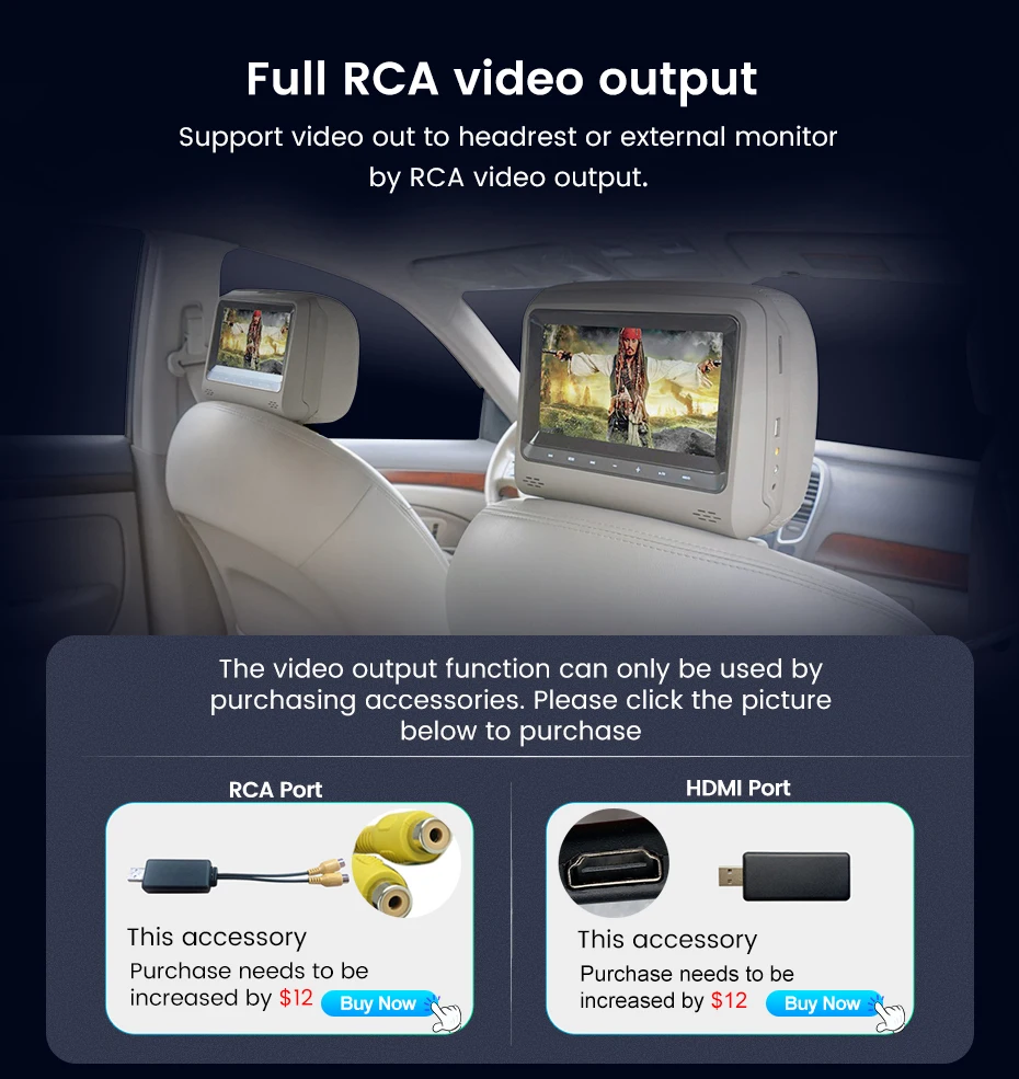 Поддержка видео на подголовник или внешний монитор с помощью RCA видеовыхода.