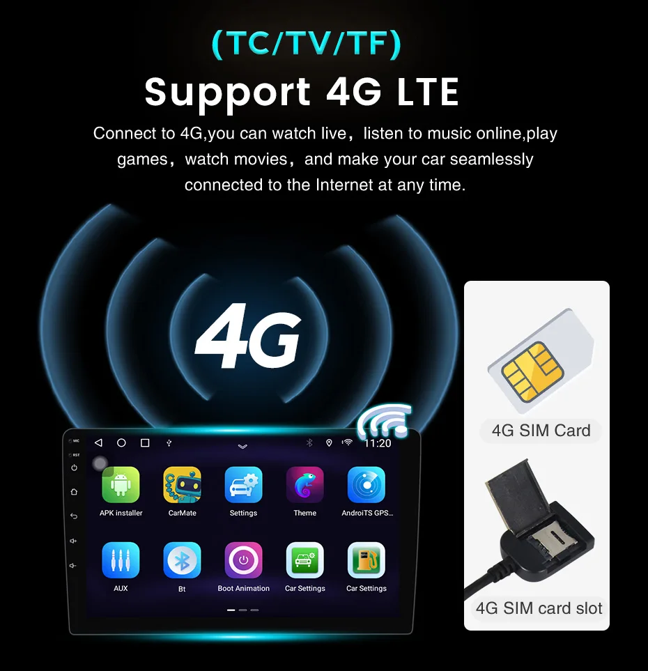 Подключайтесь к 4G, вы можете смотреть в режиме реального времени, слушать музыку онлайн, играть в игры, смотреть фильмы и легко подключать ваш автомобиль к Интернету в любое время.